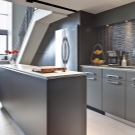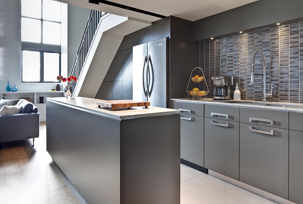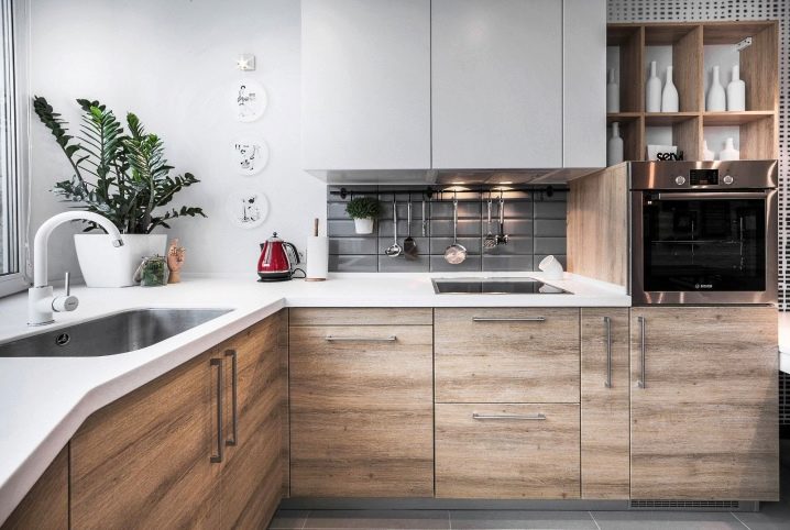 Graue Farbe ist perfekt mit Holz kombiniert, so dass die Arbeitsplatte oder Küchenfronten dieses Materials perfekt für die grauen Wände der Küche sind.