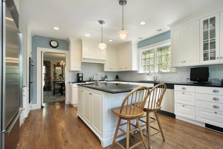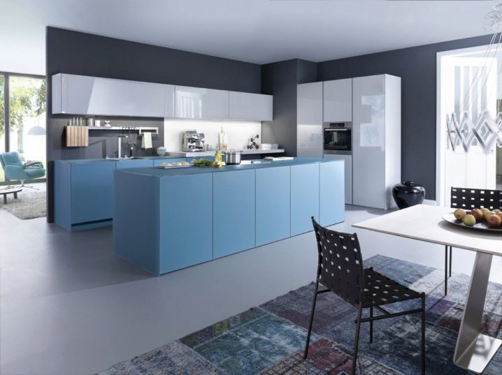 Blau und Blau. Die Fassaden dieser Farbe eignen sich hervorragend für graue Wände. Aber wenn die blaue Küche zu hell ist, kann sie mit einem weißen oder milchigen Farbton verdünnt werden.