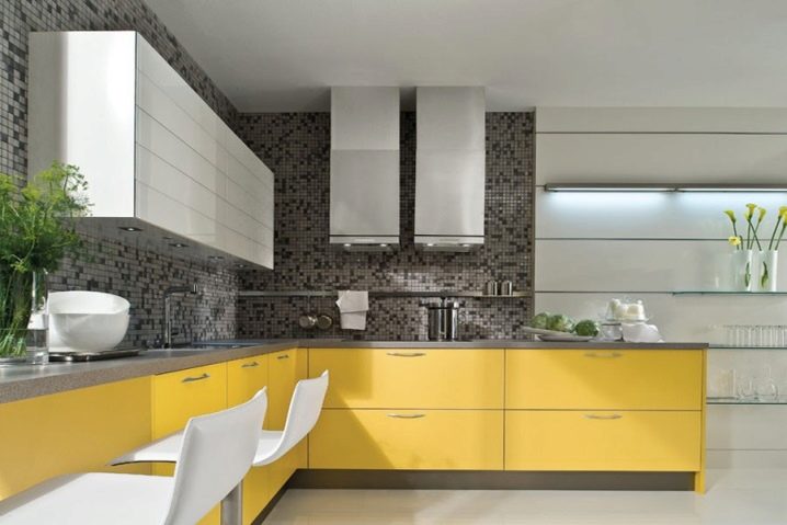 Gelb. Küchengarnituren mit leuchtend gelben Fassaden verdünnen perfekt die Grauheit der Wände. Und grau glättet die Helligkeit. Das Ergebnis wird eine helle, fröhliche Küche sein, in der es nicht nur angenehm zu kochen ist, sondern auch warme Farbtöne Ihren Appetit wecken werden.