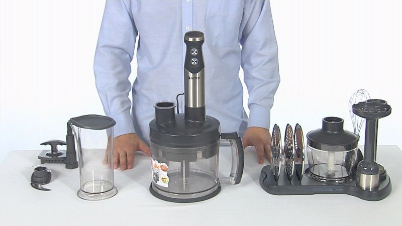 Äußerlich unterscheiden sich Tauchmischer deutlich von traditionellen. In ihnen schließt sich die Schüssel nicht. Um ein Produkt zu mahlen, legen Sie es einfach in die Schüssel und legen Sie dort den Arbeitsteil dieser Küchenmaschine ab. Drücken Sie den Ein- / Aus-Schalter am Griff und fahren Sie mit dem Kochen fort.