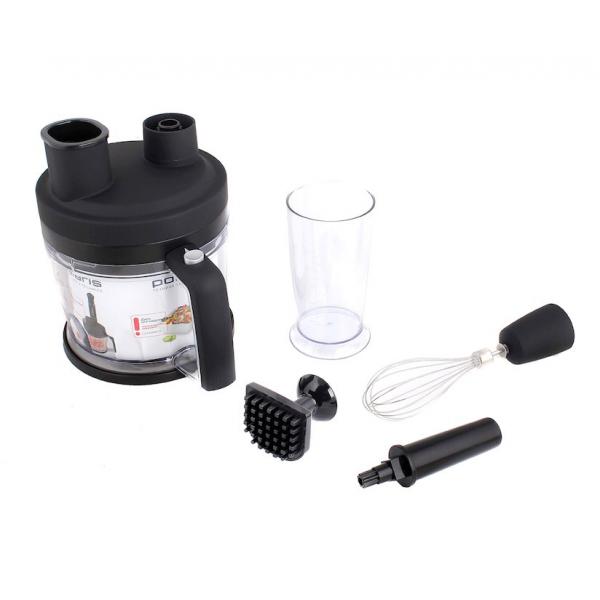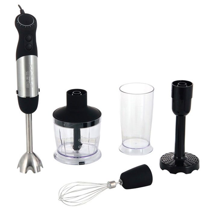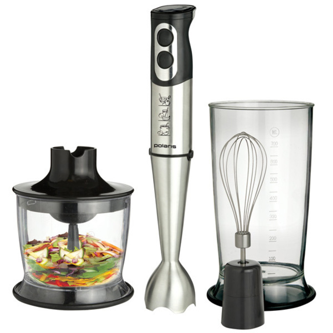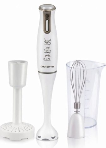 Ähnliche Produkte von der Firma Polaris ähneln in etwa einem Mischer, in dem es keine Standardschläger gibt. Diese Elemente werden durch ein bequemeres und funktionelles Element ersetzt - ein Düsenmesser mit einer speziellen Form.Dadurch können alle Produkte schnell und einfach zu einer homogenen Konsistenz gemahlen werden.