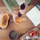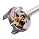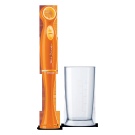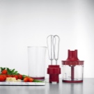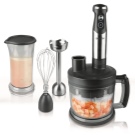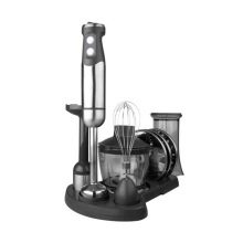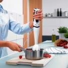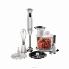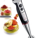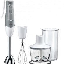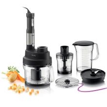 Stellen Sie das benutzerfreundlichste Modell dar. Der Mixer hat eine längliche Form und besteht aus mehreren Teilen: einem Stützgriff, einer abnehmbaren Düse und Klingen. Um die Klingen herum befindet sich eine spezielle Lünette, die das Spritzen von Speisen verhindert. Alle Aktivierungstasten befinden sich auf dem Bedienfeld und sind für maximalen Komfort griffbereit. Dank einer speziellen Gummierung können Sie das Gerät so gut wie möglich in der Hand halten.