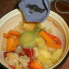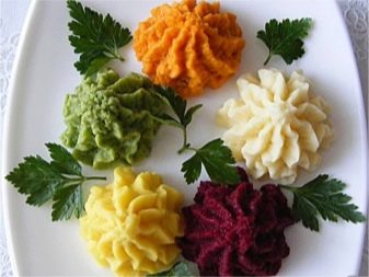 Es sieht interessant gefärbte Kartoffeln aus. Um verschiedene Farben zu erreichen, werden Karotten, Rüben, Petersilie, Brokkoli oder Kürbis zu der fertigen Mischung hinzugefügt. Jeder der hellen Zutaten wird vorgekocht und zu einer homogenen Mischung verarbeitet, da die Dauer des Mahlens von Kartoffeln und anderem Gemüse unterschiedlich sein kann.