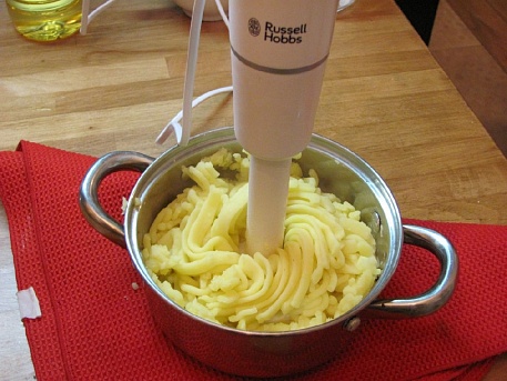 Vor dem Garen die Kartoffeln kochen, die Milch kochen und die Butter schmelzen lassen. Dann beginnen Sie, die Zutaten mit einem Mixer zu mischen, um den Prozess nicht zu verzögern.