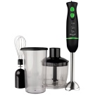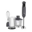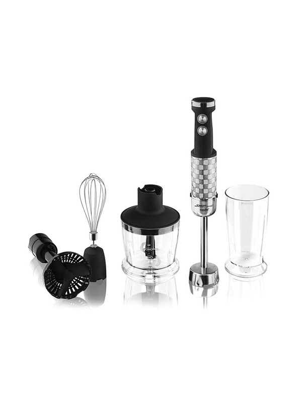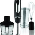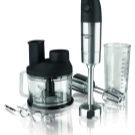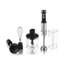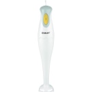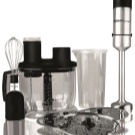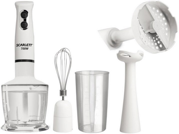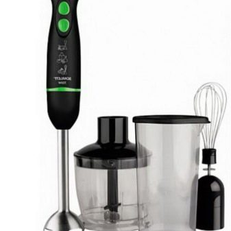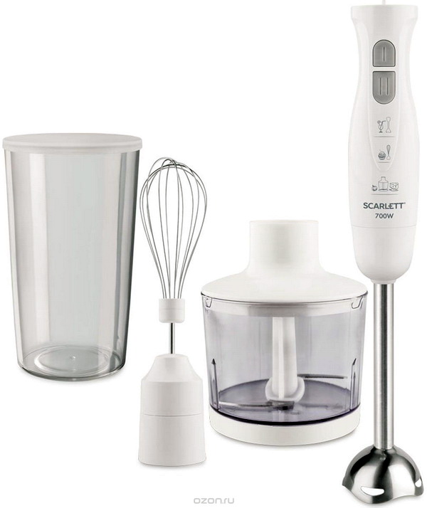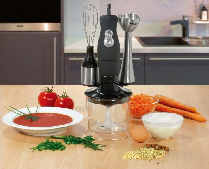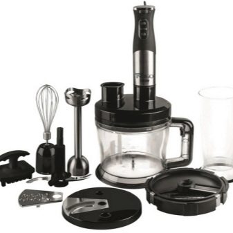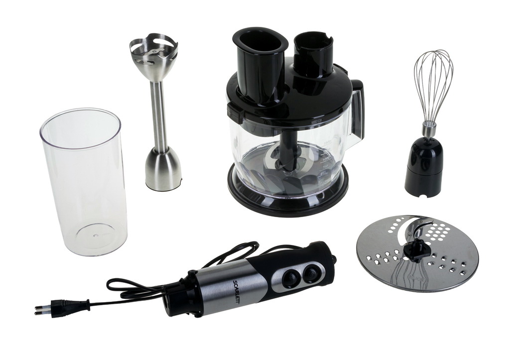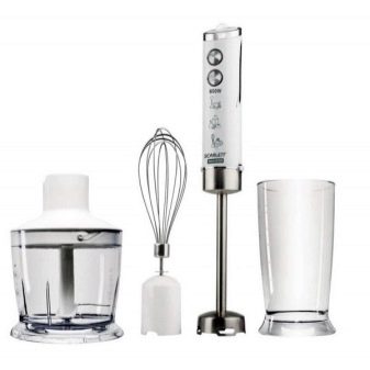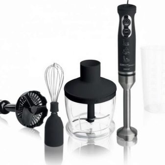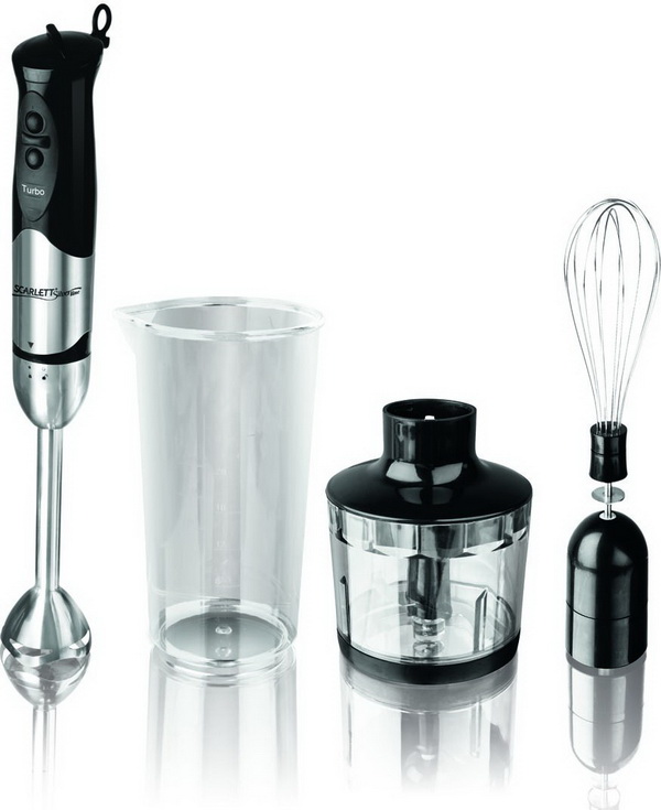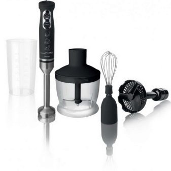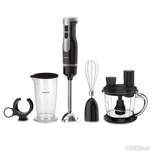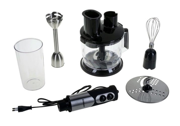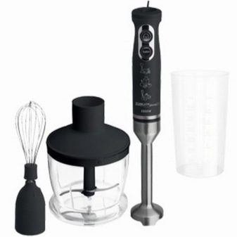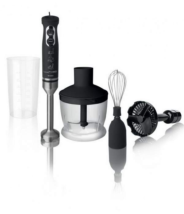 Der Stabmixer besteht aus einem Motorteil mit Griff, Drehzahlwähler, Turboknöpfen, Impulsbetrieb und Trenndüsen. Blender Bein endet mit einem Schneebesen. Das Gerät ergänzt die Düse zum Schlagen von flüssigen Produkten, die mit einem Adapter am Körper befestigt wird.