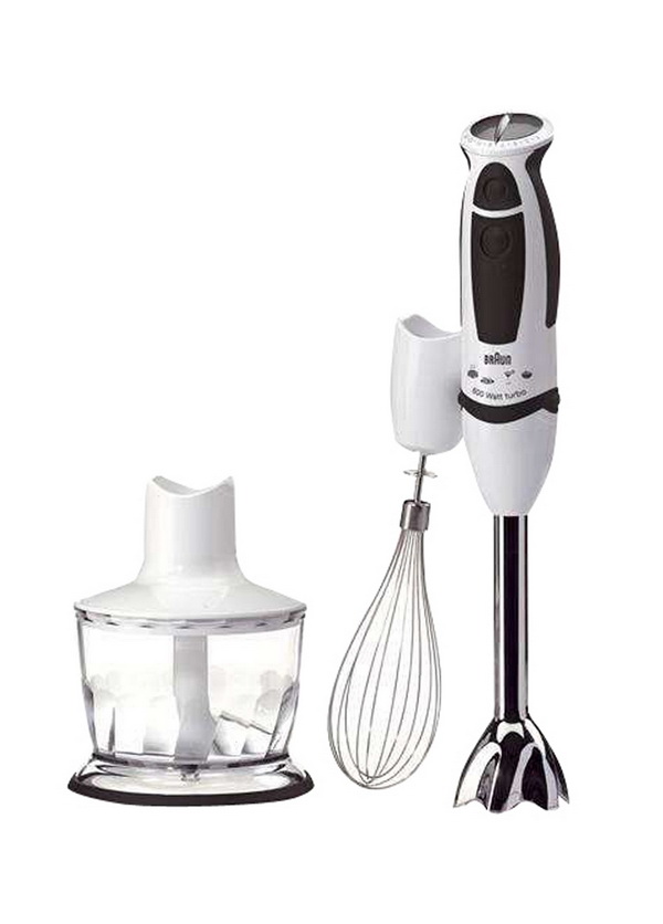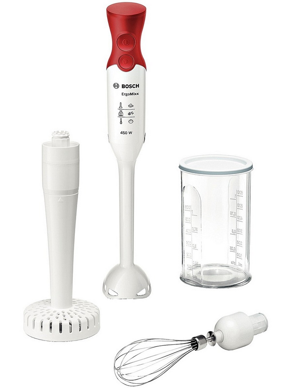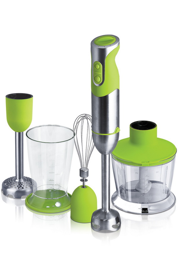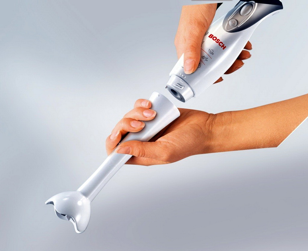Neben dem Stand- und Stabmixer können Sie sich auch mit einem Tauchmodell "bewaffnen". Dies ist ein kompaktes Produkt, bei dem sich der Motor im Griff befindet und verschiedene Düsen daran angebracht sind. Sie verwenden absolut jeden Container dafür. Zum Mahlen von Speisen genügt es, den Mixer in eine Schüssel oder ein Glas zu legen, um einen gesunden frischen Saft zu erhalten, für die ersten Gänge zu braten usw. Eine wichtige Voraussetzung für das kombinierte Modell ist die Auswahl von Behältern mit hohen Wänden, um Spritzer, Flecken auf Möbeln und Kleidung zu vermeiden.