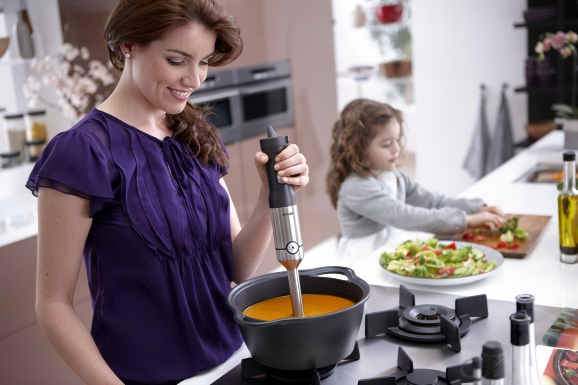Laut Bewertungen bevorzugen Hostessen meist Immersionsmodelle von Mixern. Sie brauchen wenig Platz in der Küche, um kleine Portionen zuzubereiten. Sie sind besonders beliebt bei jungen Hausfrauen, die kürzlich Mütter wurden. Babynahrung, Mixgetränke, Cerealien, Fruchtpürees - kochen Sie genau die Gerichte, die Ihre Kinder mögen!
