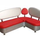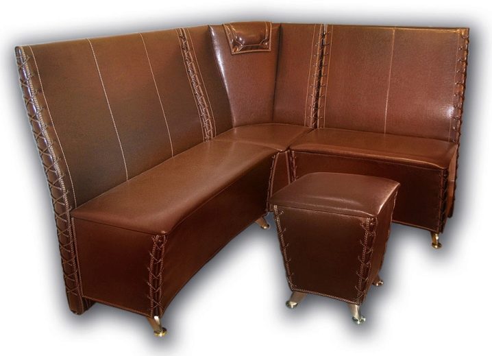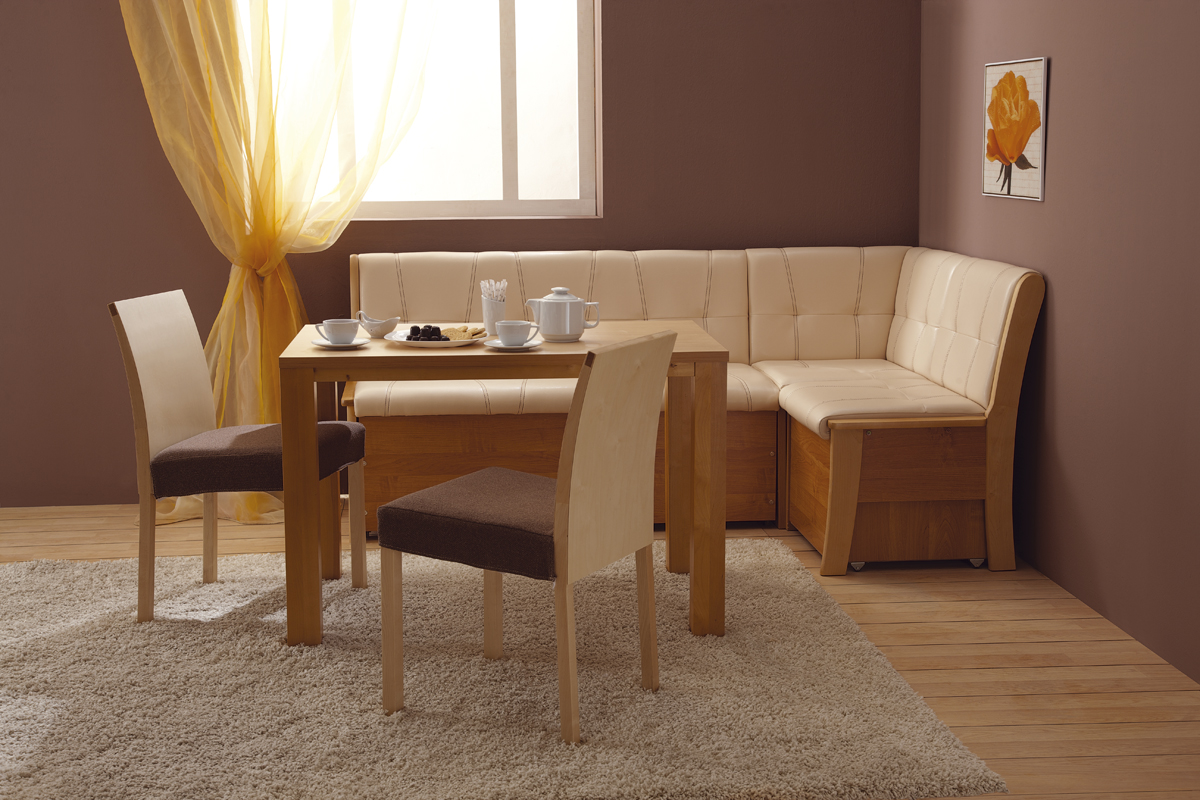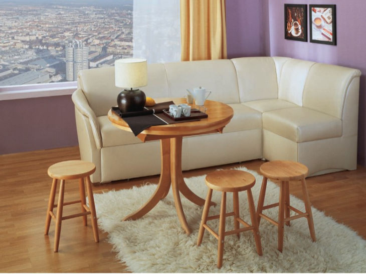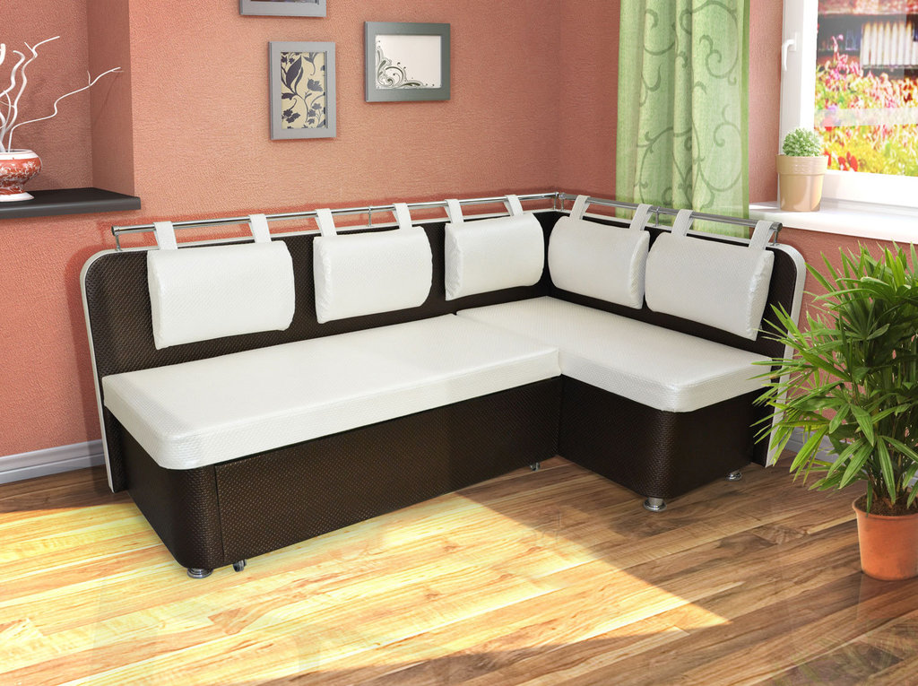 - Standard. Modell für etwa vier oder fünf Personen mit zusätzlichen Daumen, die normalerweise enthalten sind. Diese Sofas sind für eine mittelgroße Küche ausgelegt. Teurere Eckmodelle können Regale zur Aufbewahrung von Dingen und sogar eine Minibar haben.