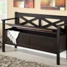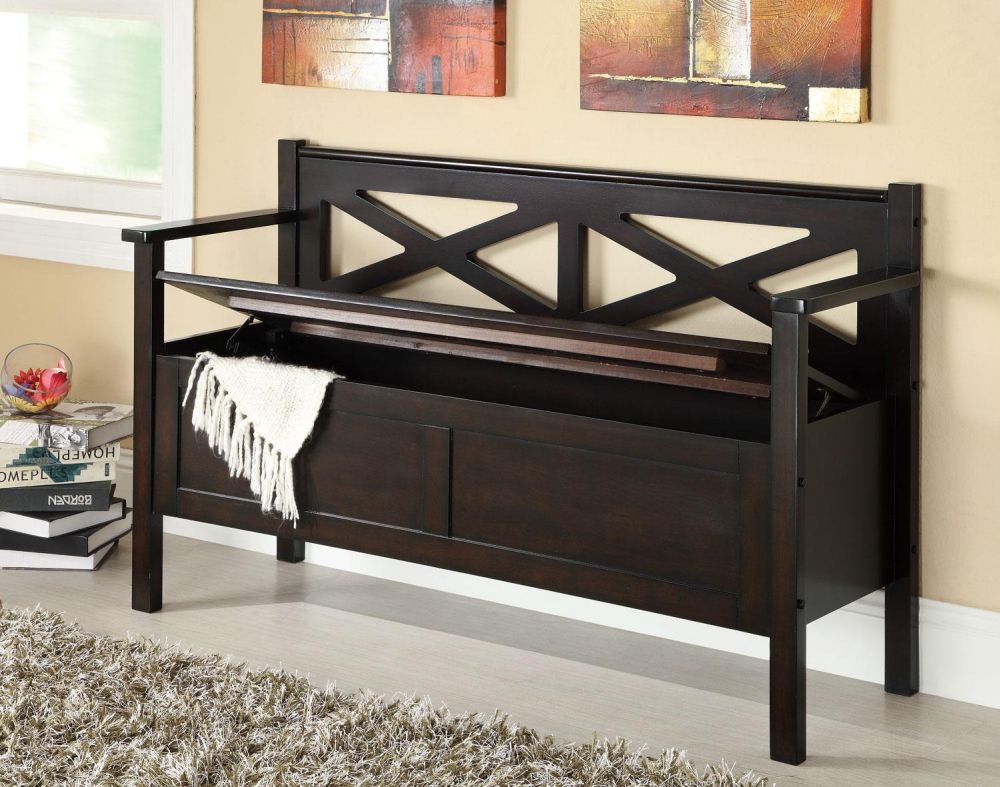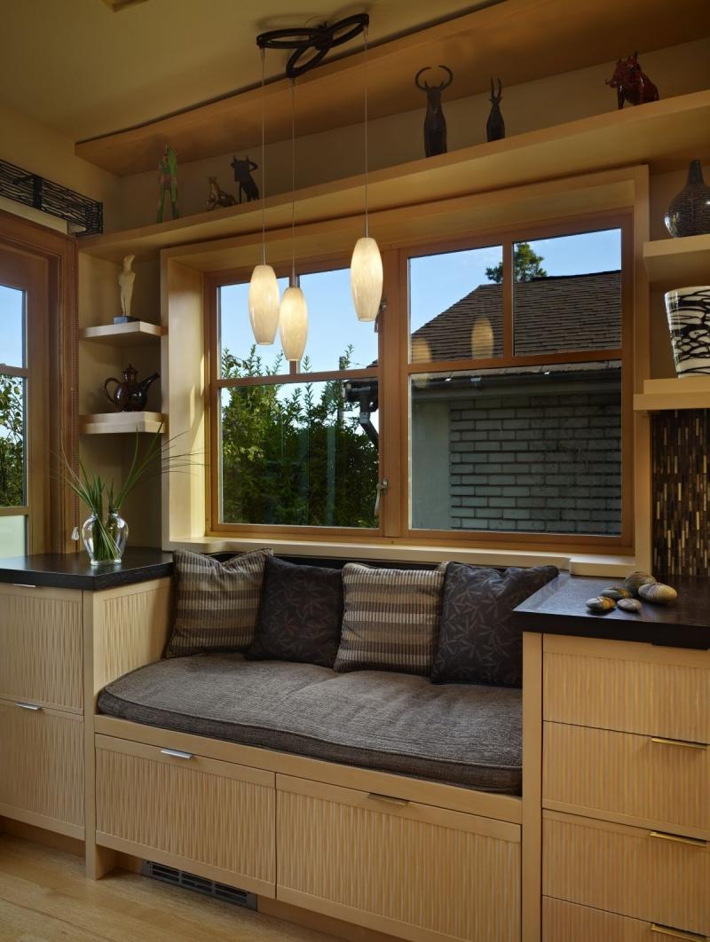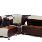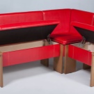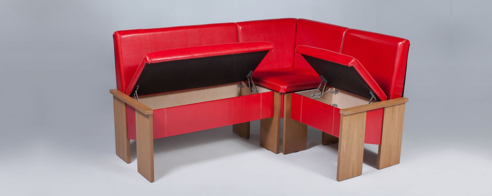 Der Stauraum in diesem Design wird von einem der aufsteigenden Sitze ausgespielt, der eine voluminöse, in das einteilige Gehäuse integrierte Nische freigibt. Aber das ist bei weitem nicht die einzige Option - die Bänke sind im modularen Modell zu finden, alles hängt von der ursprünglichen Idee ab.