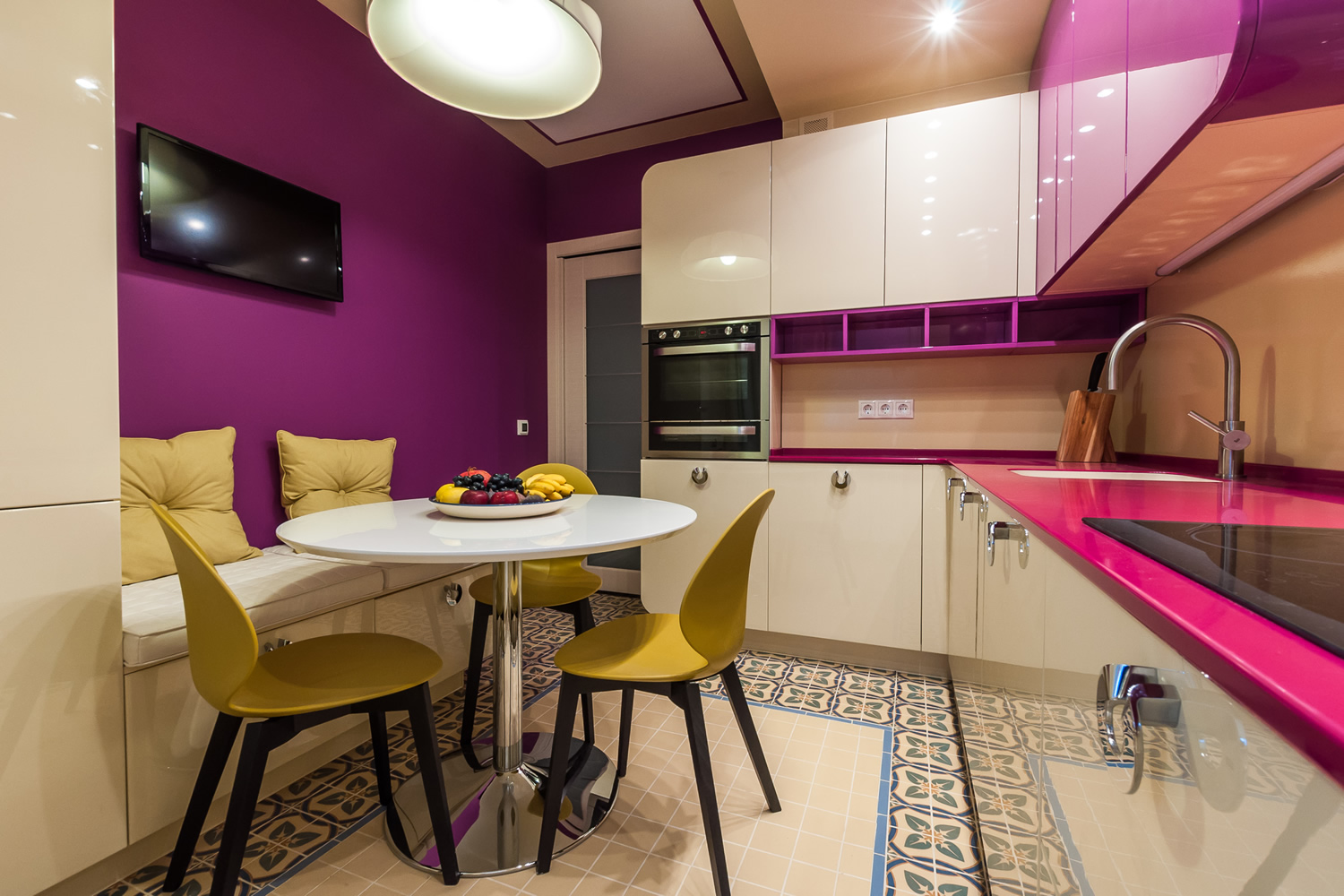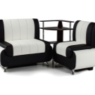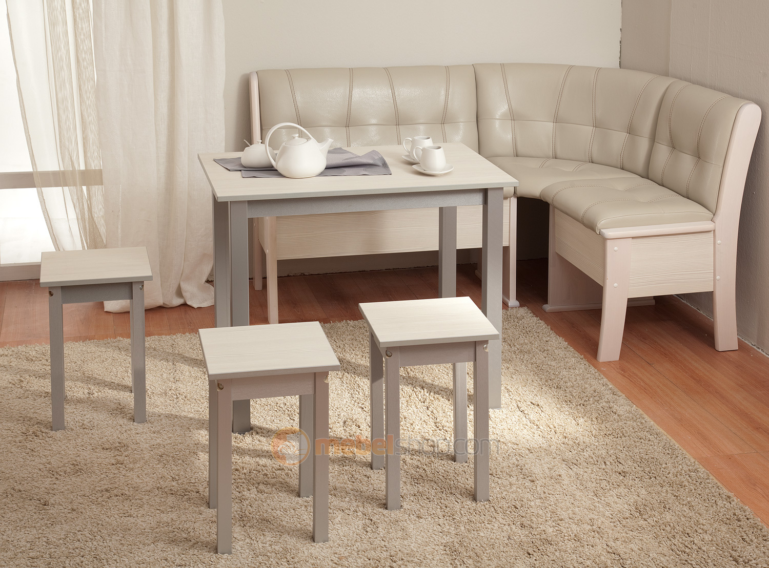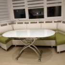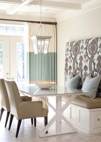 Der Vorteil liegt nicht nur in der Optimierung des Platzes, sondern auch in der Möglichkeit, einen Tisch beliebiger Form auszuwählen, einschließlich der am meisten laufenden rechteckigen Tischplatte. Auch eine Reihe von Herstellern vervollständigen das Set mit einem eigenen Tisch und mehreren Hockern oder weichen Stühlen, abgestimmt auf die Polsterung.