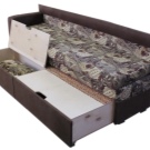 Er ist ein Sofa-Shop, und die stilvollste Option, perfekt kombiniert ein starkes Massivholz und Dutzende von Polsterungsoptionen. Meistens hat es eine direkte Konstruktion, obwohl es auch eckige Varianten gibt. Er hat fast nie Armlehnen und bei reduzierter Nutzbreite erlauben die Gesamtmaße eine Nutzung als Zusatzbett, so dass man eine solche Aussicht nicht als zu eng bezeichnen kann.
