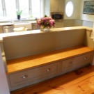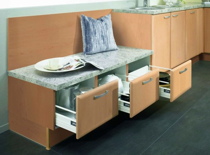 Lebende klassische Möbel, migrierte in die Küche. Der Hauptnachteil ist der hohe Platzbedarf - es sollte viel Platz sein, damit die Armlehnen nicht auf dem Tisch liegen und der Schubladen- deckel selbst, der die Rolle eines Sitzes spielt, frei ohne Berührung geöffnet werden kann.