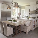 Innovative Technologie, die mehr auf ästhetische Verkörperung als auf Praktikabilität setzt. Voraussetzung ist eine Kombination von Metall-, Holz-, Leder- oder Textilelementen in beliebiger Reihenfolge. Es ist vielschichtiger als High-Tech und andere "Jugend" -Trends, aber dies wird immer häufiger in den einfachsten Küchen gefunden.