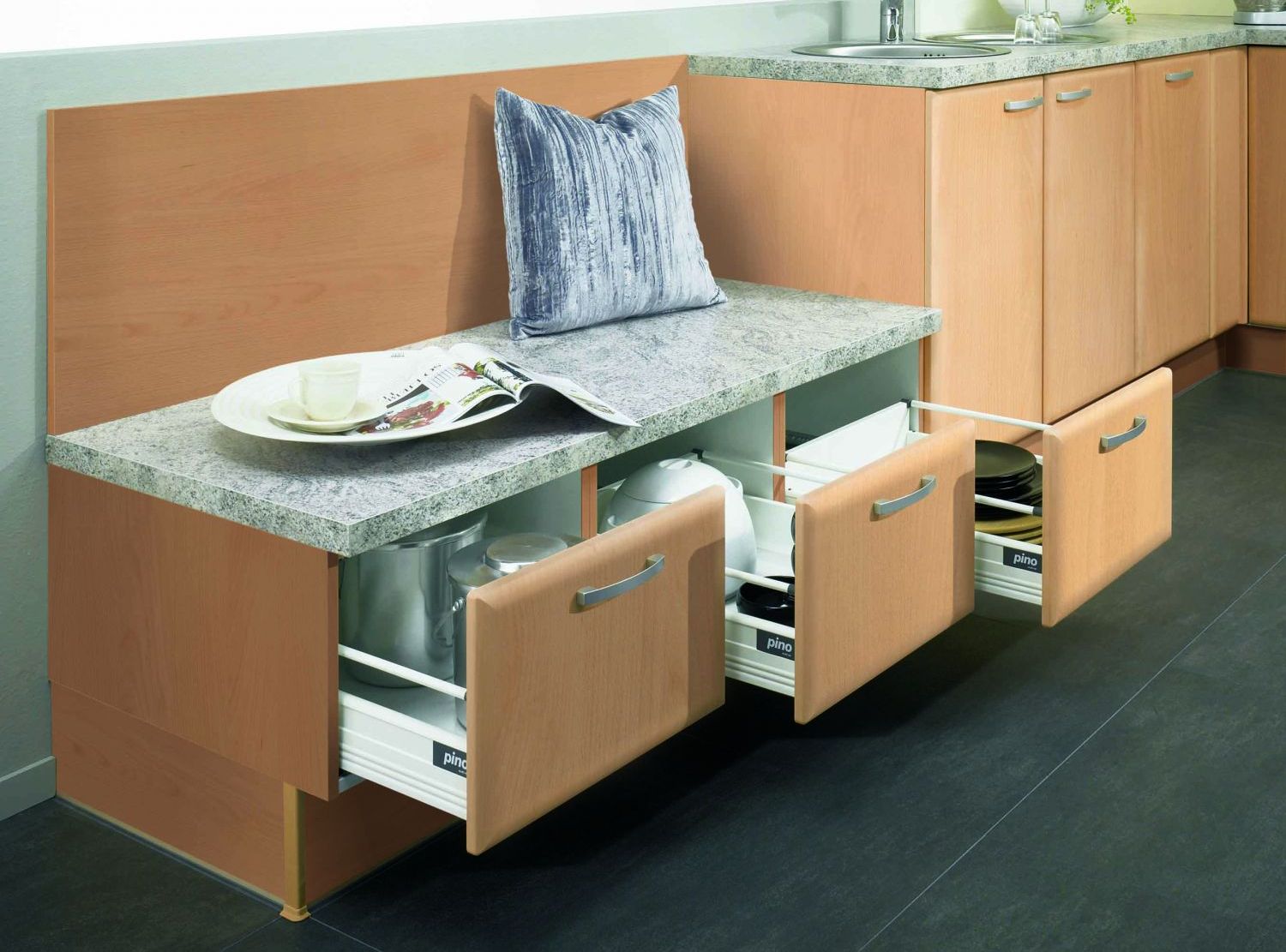 Die Anzahl der Schubladen ist hier nicht begrenzt, sie können unter dem Sitz versteckt sein oder ein traditionelles versenktes Schiebesystem darstellen. Die Alternative ist eine Gaslift-Schwenktür, wenn die Bauhöhe dies zulässt.