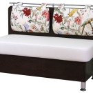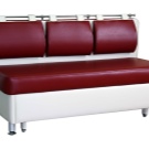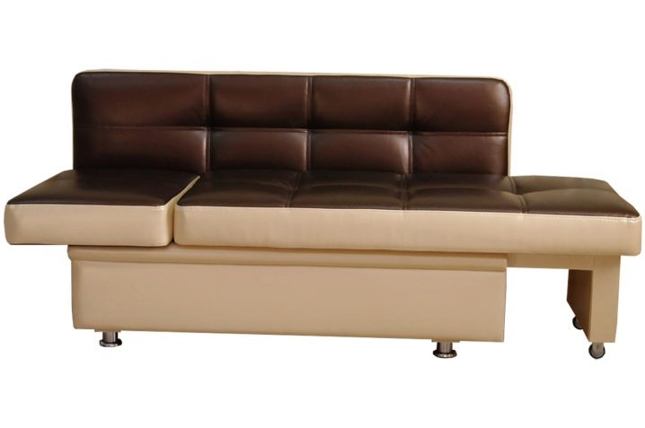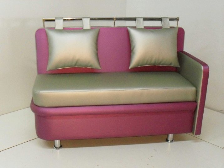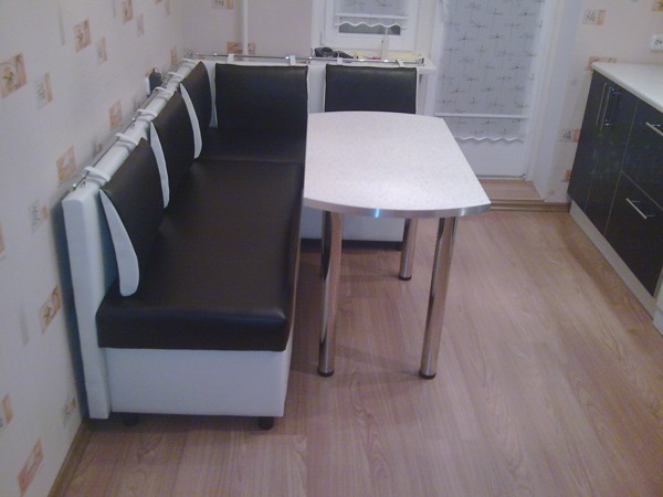 Da zuerst das Sofa in der Küche die Stühle ersetzt, dann entspricht seine Form in den meisten Modellen dem Zweck: der Sitz ist ziemlich hart, und der Rücken ist dünn, fast gerade, oft an der Wand für die Stabilität angebracht. In komfortableren Optionen gibt es eine Analogie zu Stühlen in Cafés oder Restaurants. In teuren Modellen, in denen der Liegeplatz zur Verfügung gestellt wird, können Federn oder dünne Matratzen aus Latex verwendet werden.