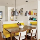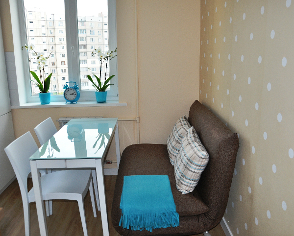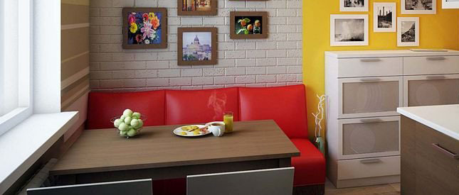 Die direkte Form ermöglicht es Ihnen, das Sofa an jedem geeigneten Ort zu platzieren, und wenn Sie neu anordnen möchten. Die eiserne Regel des Essbereiches ist, dass das Sonnenlicht auf den Tisch fallen sollte, aber keine blinden Menschen, also ist es besser, das Sofa zurück zum Fenster oder gegenüber der Kücheneinheit gegen die Wand an der Seite des Fensters zu stellen.