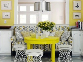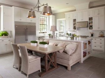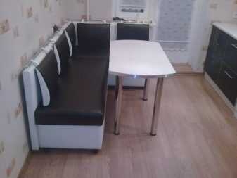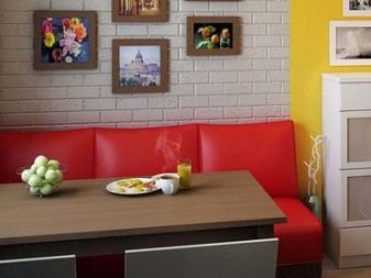 Um die Stühle zu ersetzen, muss das direkte Küchensofa etwas gedehnt werden.Es ist notwendig, in das Stil-Ensemble des Raumes zu passen, um dem Farbschema des Tisches zu entsprechen. Idealerweise haben Sie die gleiche Polsterung mit dem Esstisch, die gleiche Struktur von Holzteilen oder die Beschichtung von Metallelementen. Es ist eine erfolgreiche Lösung, das Sofa zu einem Akzent auf die Zusammensetzung der Küche zu machen, nur die Farbunterstützung einiger anderer Elemente wird benötigt.