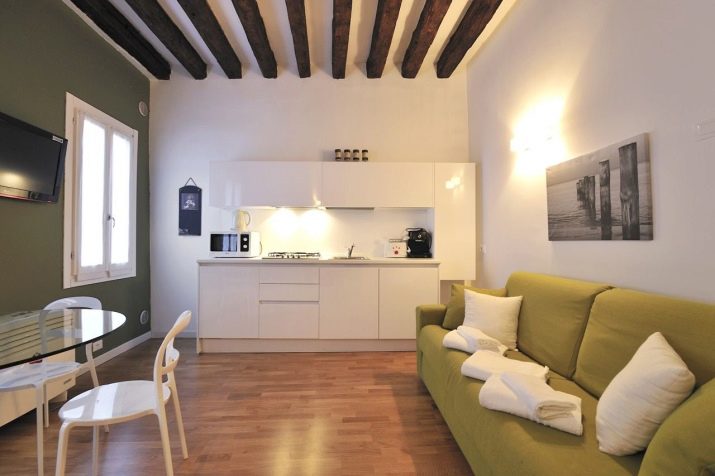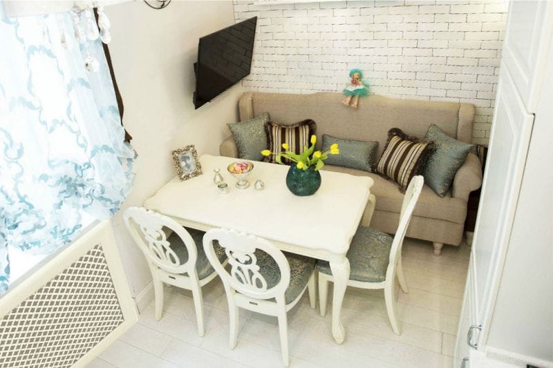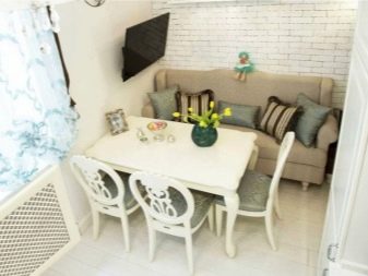 Die Abmessungen des Sofas hängen von der Raumfläche und dem zugeteilten Platz für den Essbereich ab. Berücksichtigt werden und die Verhältnisse der Situation. Ein massives Headset zum Beispiel wird Polstermöbel mit hohem Rücken und starker Basis übernehmen. Eine einstöckige oder leichte Küche erfordert dagegen ein luftiges Design.