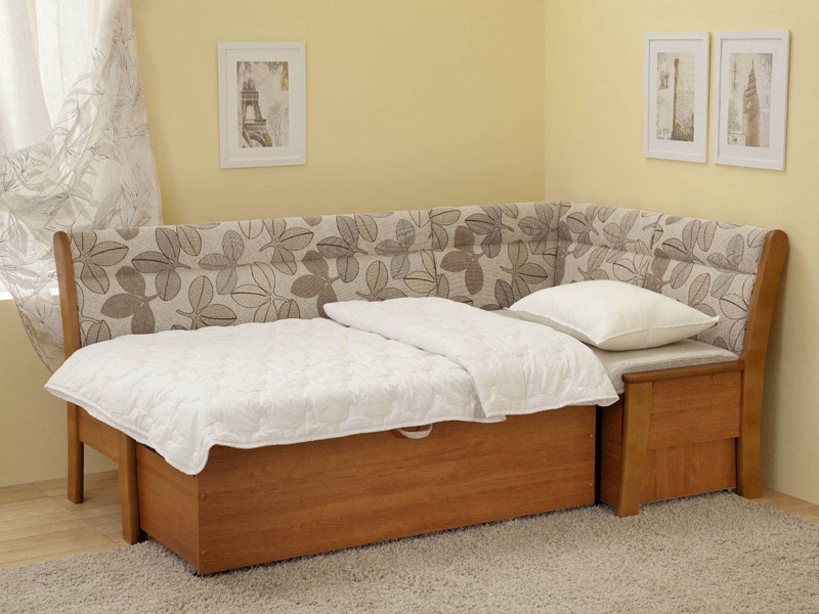 - Französisches Kinderbett - ideal für Gäste in einer kleinen Küche. Falten in einer Verlängerung der Länge, wie ein normales Klappbett. Da die Rückseite nicht an der Transformation beteiligt ist, unterscheiden ihre Formen und Design die Modelle dieses Systems von anderen. Ein Analogon des französischen Klappbettes - Sedaflex ist für den regelmäßigen Gebrauch geeignet, aber der Preis ist viel höher.