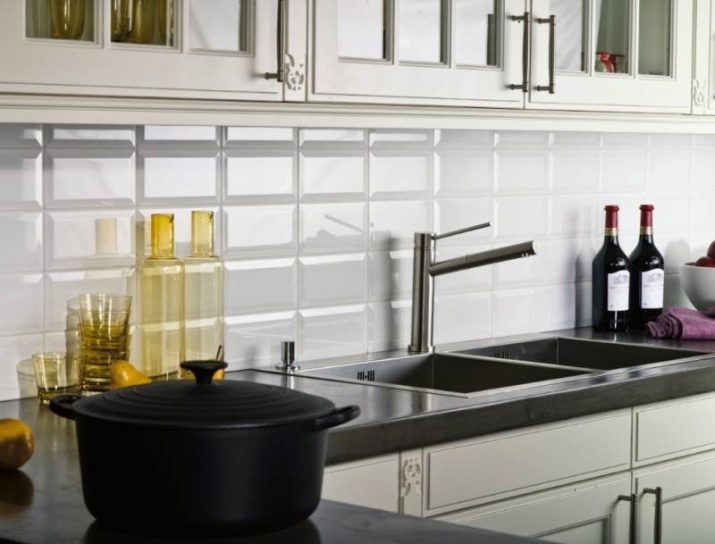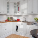 In weißer Farbe kann Keramikfliese "Schwein" oder gewöhnliche Fliese ausgeführt werden. Sie sind mit Ziegeln einer kontrastierenden Farbe durchsetzt, die den Effekt der Geräumigkeit verursacht. Jede Palette kann in Harmonie mit Weiß sein, aber stellen Sie sicher, dass die glänzenden und matten Fliesen nicht überlappen.Das schneeweiße Mosaik besteht hauptsächlich aus Smalt, Keramik oder Glas. Eine solche Technik, um den Ethno-Stil des Interieurs zu bereichern, setzt Akzente in Küchen mit der Atmosphäre von Hi-Tech, Loft, Minimal.
