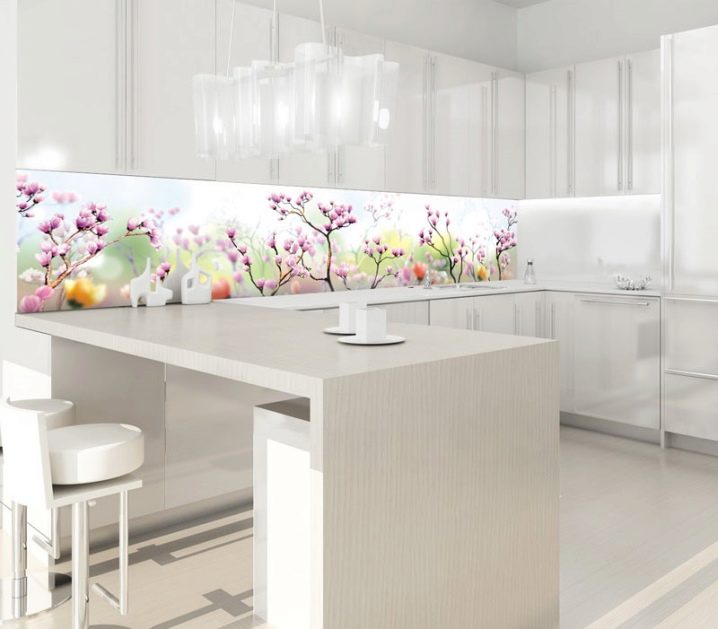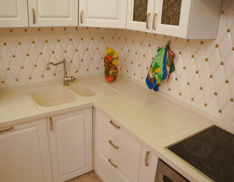 Abgesehen davon, dass helle Farbtöne frisch und originell aussehen, sollten Schürzenmaterialien eine ausgezeichnete "Barriere" gegen Verschmutzung, Ruß, Temperaturwechsel und hohe Luftfeuchtigkeit darstellen. Weißes Finish hat mehrere Vorteile: