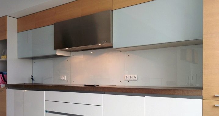 Sie können zwischen glänzenden und matten, strukturierten, sandgestrahlten Modellen usw. wählen. Durchscheinende Glasscheiben, die in den Farben einer Molkerei, einer cremefarbenen oder getönten Muschel hergestellt werden, gewinnen immer mehr an Beliebtheit. Diese Komposition wird perfekt in der Küche aussehen, wo selbst ein Möbelset glatte Linien, moderne Technologien und viele Glasdekorelemente zeigt.