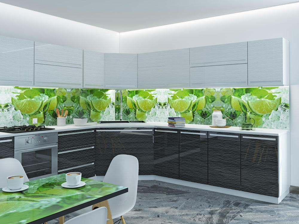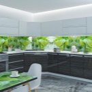 Die Vorteile des Materials sind hohe Dichte, Temperaturbeständigkeit und Festigkeit. Kunststoff-HDF-Platte gut schützt die Wände vor dem Eindringen von Fett und das Auftreten von verschiedenen Verunreinigungen und sogar Schimmel. Wenn Sie das Design aktualisieren müssen, kann die Schürze leicht entfernt und durch eine andere Option ersetzt werden.