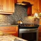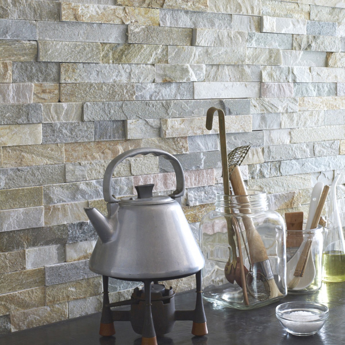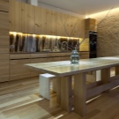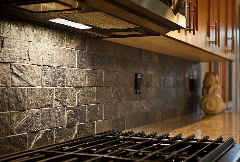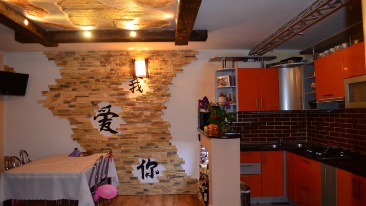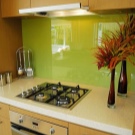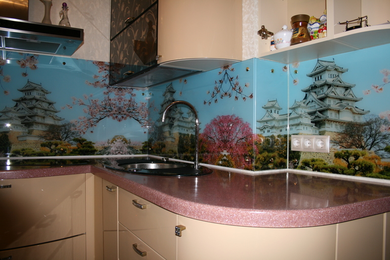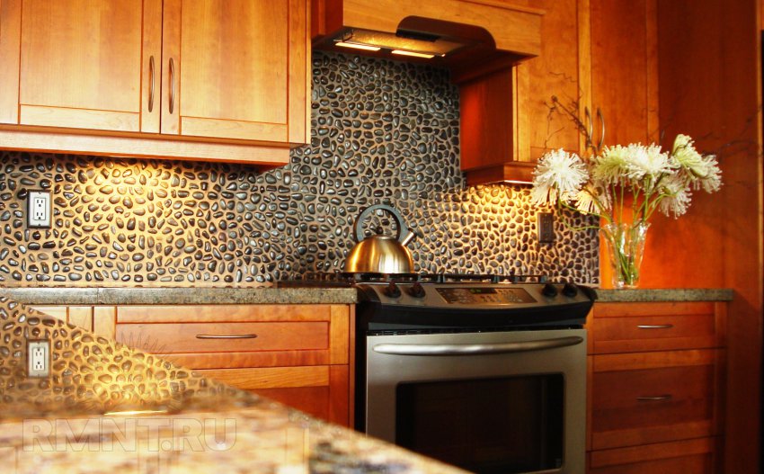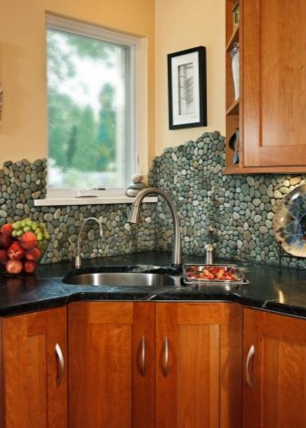 Künstlicher Stein wird nicht oft für die Verkleidung einer Küchenschürze verwendet, was bedeutet, dass Sie einer der ersten sein können. Um diesen Raum zu beenden, sollten Sie einen Acrylstein nehmen, er wird Ihre Wand besser vor Feuchtigkeit und Fett schützen und vor allem den Arbeitsraum dekorieren.