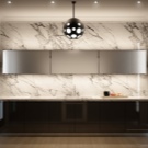 Für die Dekoration der Küchenschürze müssen nicht unbedingt Fotoprints verwendet werden, Sie können auch 3D-Panels und Muster verwenden.Es wird sehr ungewöhnliche Säulen aussehen, die Wandschränke zu unterstützen scheinen.