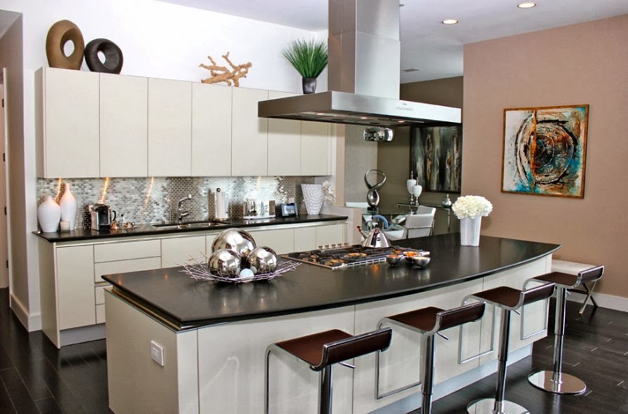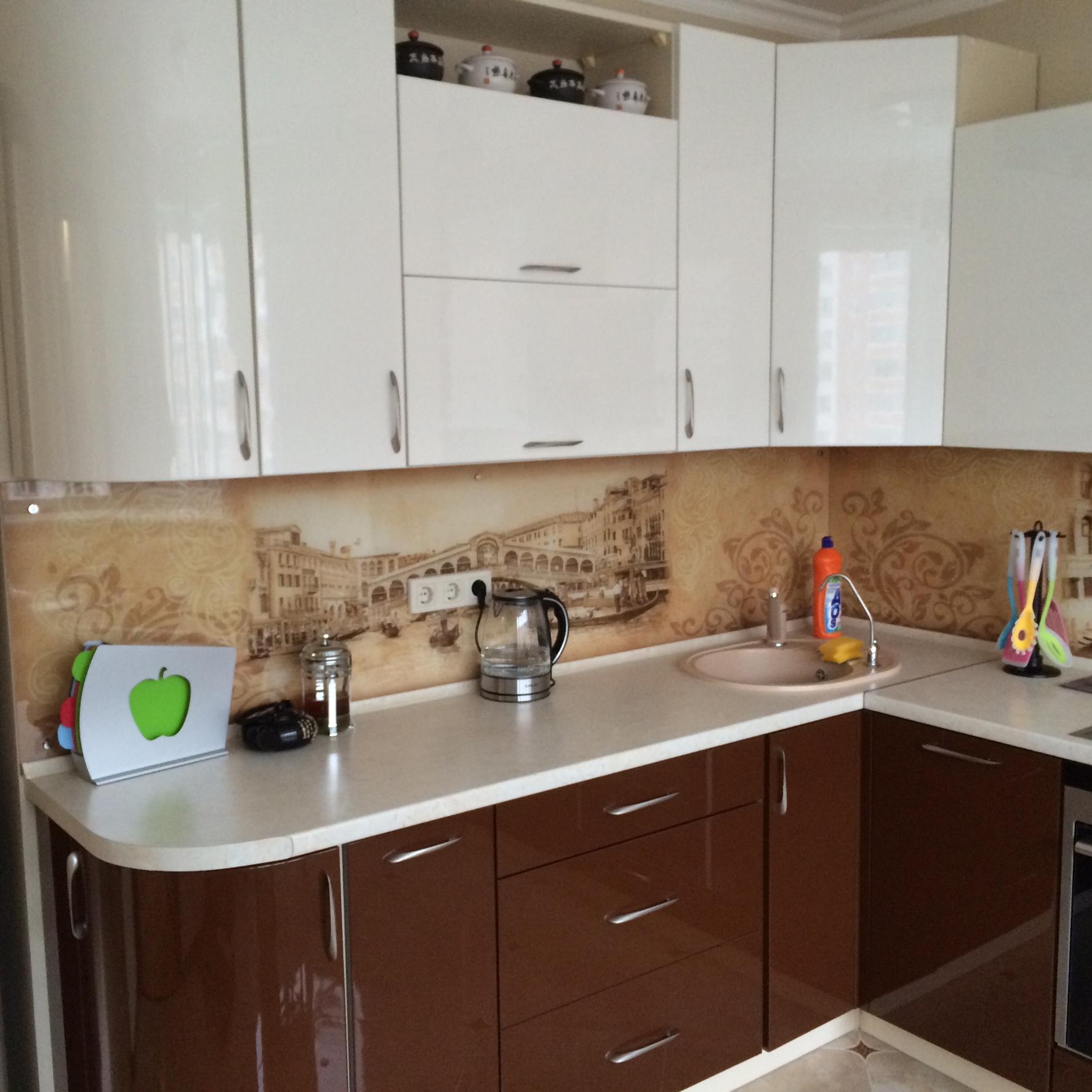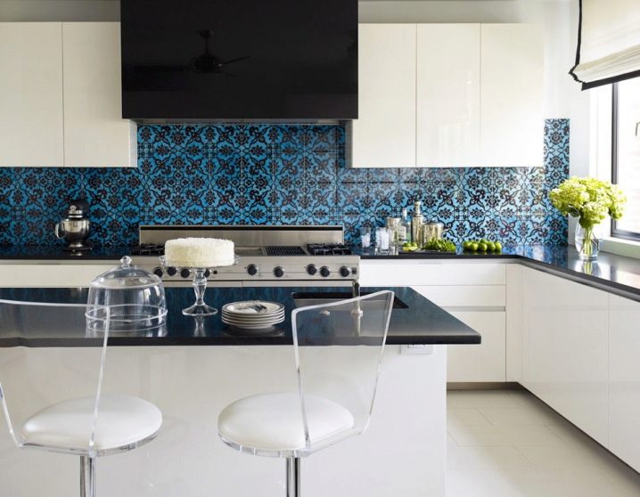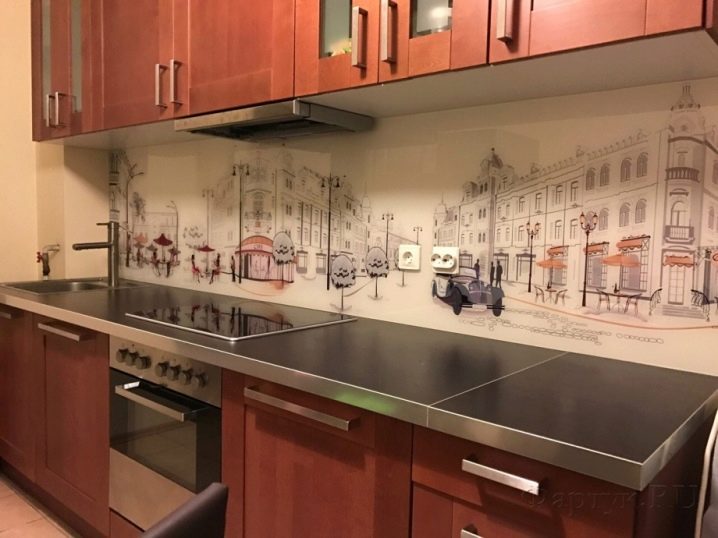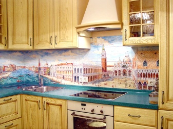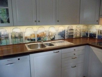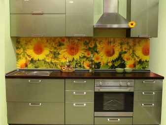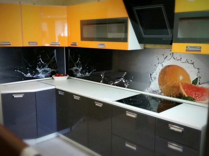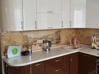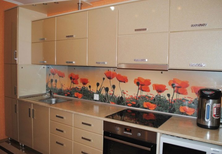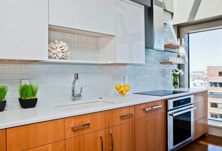 Je nach Art des Küchenraums können die Paneele aus Glas bestehen, die mit kleinen oder großen Keramikfliesen aus MDF oder Kunststoff dekoriert sind, die auf beliebige Art und Weise mit Fotodrucken verziert werden können.Die Farbe der Schürze sollte nicht nur mit der Küche, sondern auch mit der Farbe der Küchenwände kombiniert werden, und wenn Sie besonders wählerisch sind, können Sie sie auch mit Tisch- und Haushaltsgeräten kombinieren. Kontrastoptionen sind sehr interessant, zum Beispiel eine weiße Wand und eine schwarze glänzende Schürze. Auch der gesamte Küchenbereich kann monoton sein und die Schürze kann das einzige helle Element sein.