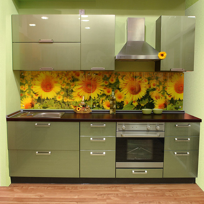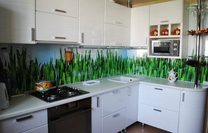 Das Bild des grünen Grases fügt dem Kücheinneren Elemente des Öko-Stils hinzu. Gutes Grün sieht in der hellen Küche grün aus: auf weiß, beige oder komplett unter dem natürlichen Holz. Weißer Glanz ist jetzt besonders relevant.