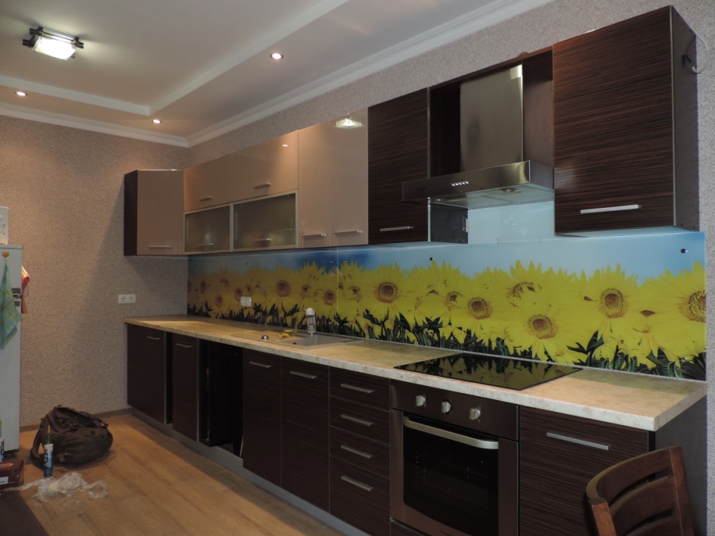 In einer Standardküche in der Höhe erreicht eine Schürze normalerweise 60 cm, aber für die Originalität können Sie eine Platte nach individuellen Parametern bestellen. Sie hängen in erster Linie von Ihrer Größe und zweitens von der Art der Platte ab. Je niedriger Ihre Höhe ist, desto tiefer hängen die Wandschränke und Sie brauchen keine hohe Schürze.