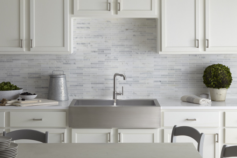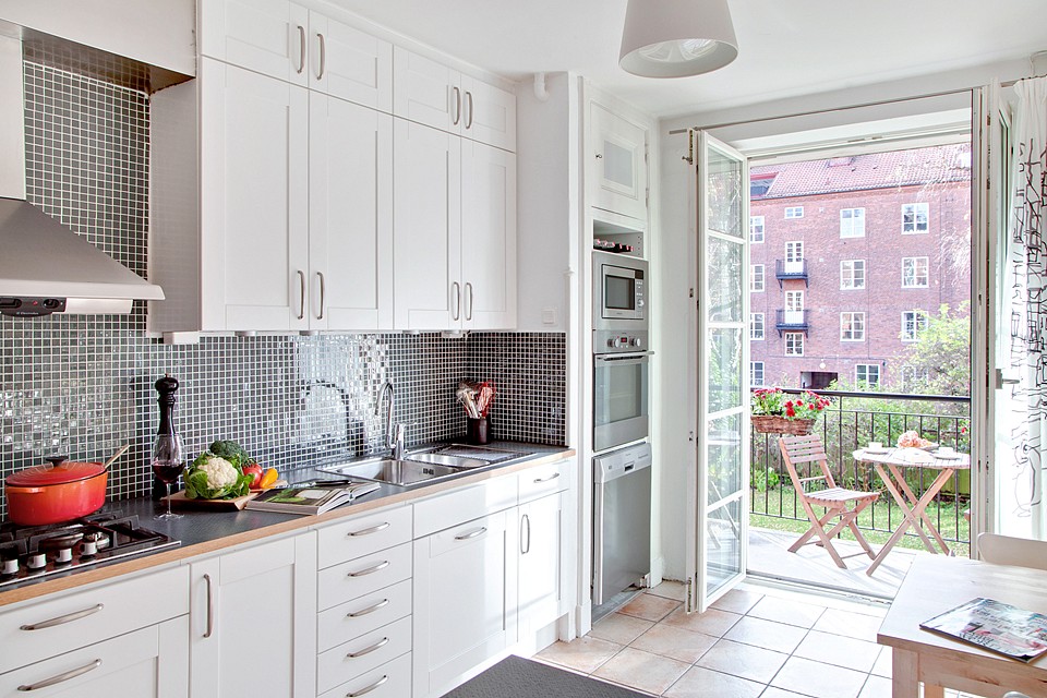- Weiß ist eine der vielseitigsten Farben in der Küche.Es ist perfekt mit Haushaltsgeräten der gleichen Farbe, und Finishing-und dekorative Elemente kombiniert. Wenn Sie plötzlich entschieden haben, dass eine einfarbige weiße Schürze banal ist, dann können Sie sie mit mehrfarbigen Mosaikdetails oder einzelnen Einsätzen von Fliesen anderer Farben kombinieren.