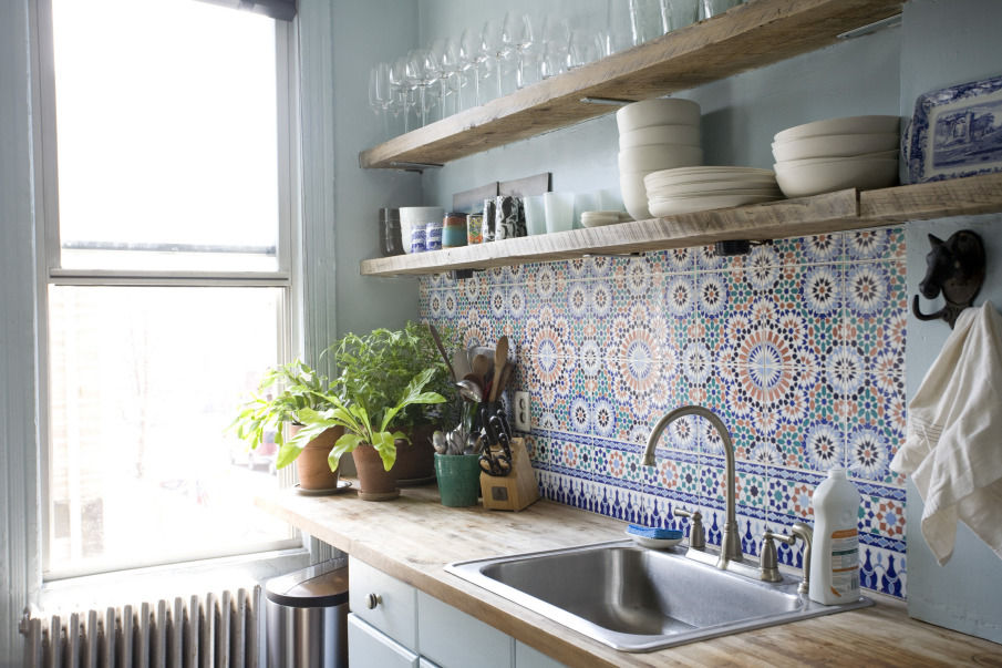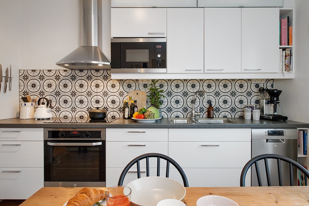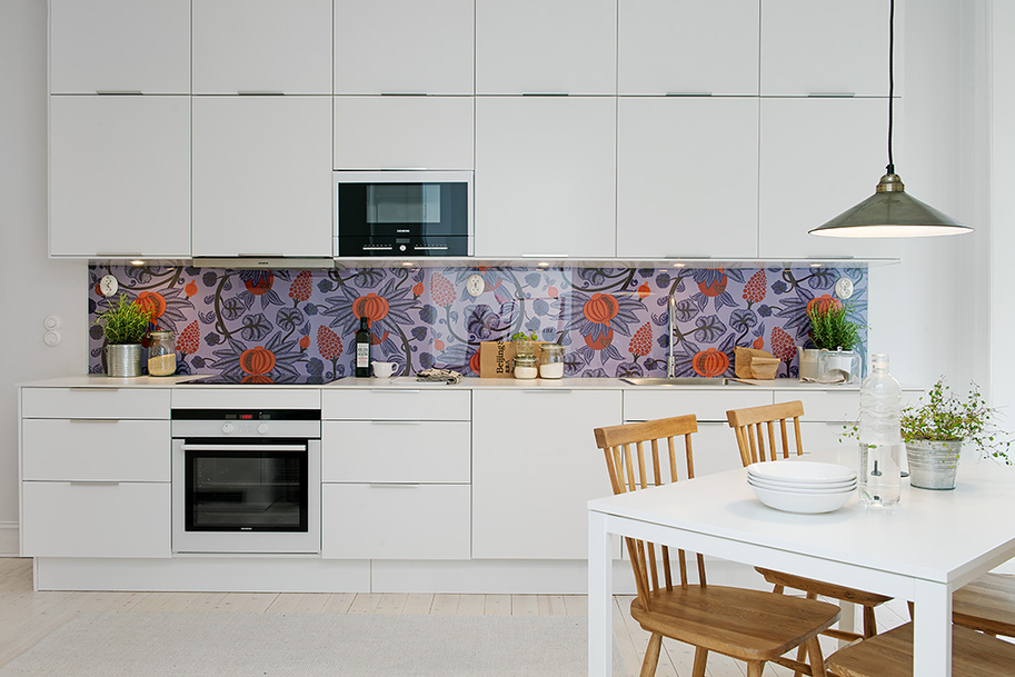 Wenn Ihr Budget begrenzt ist, gibt es immer die Möglichkeit, eine billige Küchenwand mit glatten, einfachen Fassaden zu wählen, einfache Tapeten und Uni-Böden zu wählen und den Restbetrag auf eine hochwertige helle Schürze auszugeben, die zum Highlight der Küche wird und Ihre gestalterischen Fähigkeiten widerspiegelt.