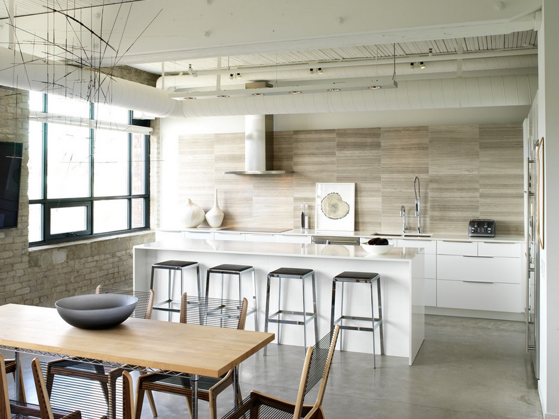 - Die Verwendung von nicht standardmäßigen dekorativen Elementen, die an die "Fabrik" Vergangenheit des Raumes erinnert werden.