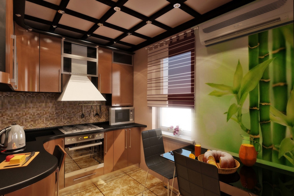 Das Paneel mit dem Originalbild aus grünem Bambus um die Küche mit natürlichen Motiven zu dekorieren. Es ist sehr praktisch, Bambus mit Kunststoffoberflächen, Keramik und Glas zu kombinieren.