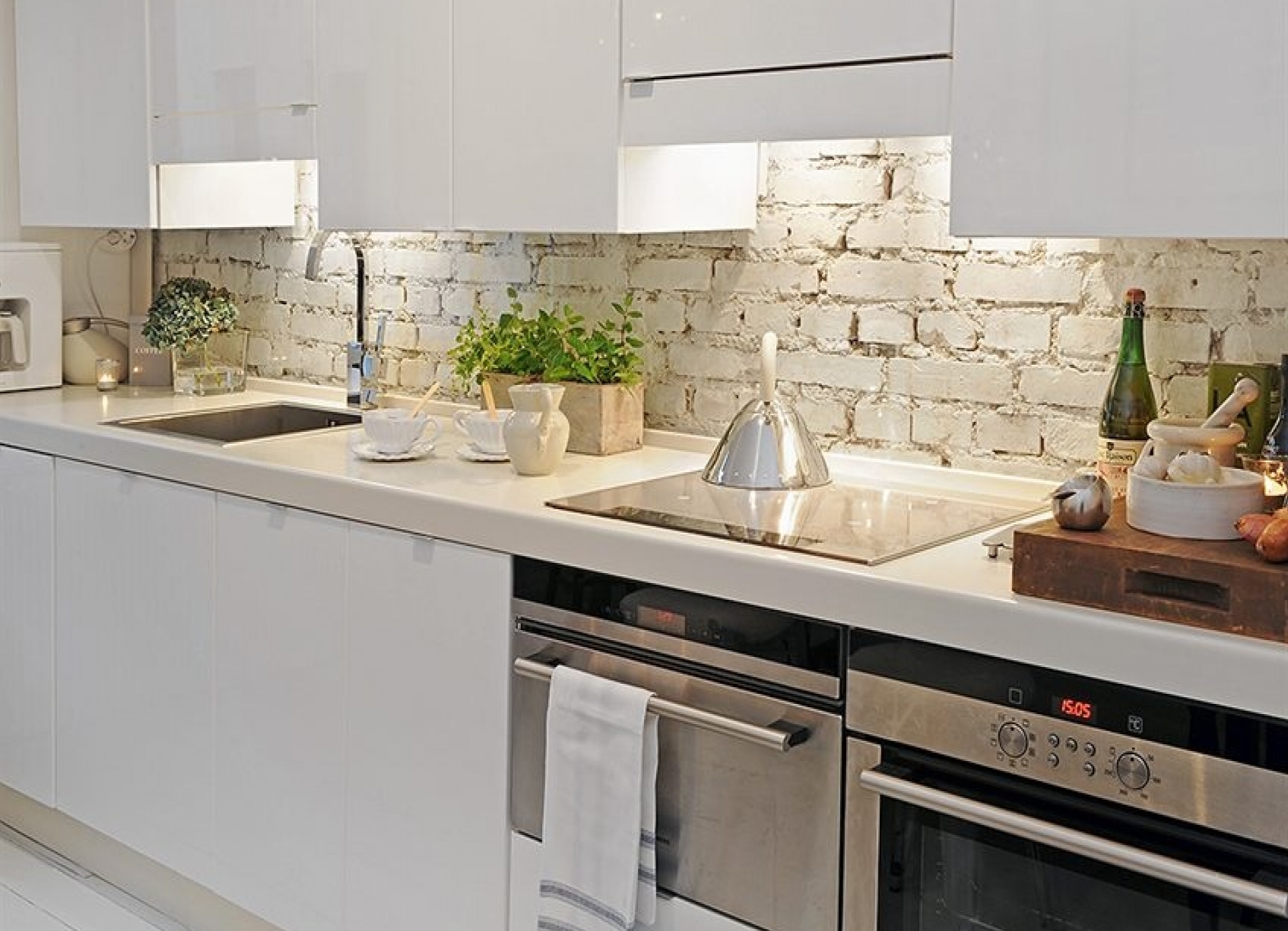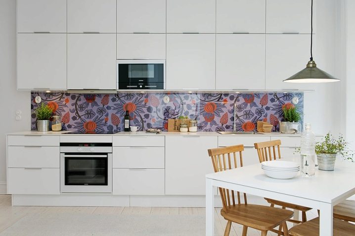 Das Beste von allem ist der skandinavische Stil, der durch die Elemente aus weißen Tönen verkörpert wird. Daher kann eine Küchenschürze mit Imitation von gebleichtem Holz oder Mauerwerk hergestellt werden. Sie können es auch mit kalten farbigen Keramikfliesen auslegen. Andere geeignete Optionen sind Glas und Mosaik.