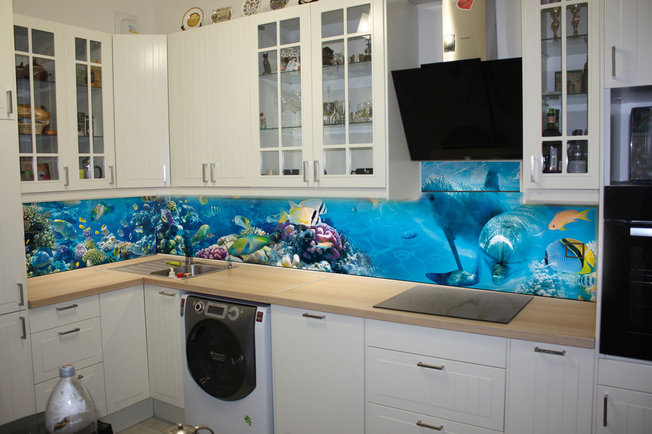 Auf der Küchenschürze können Sie jedes Bild mit Fotodruck so auftragen, dass es zu Ihrem Interieur passt. Marine Themen sind immer noch die beliebtesten. Daher können Sie ein realistisches Aquarium im Innenraum erstellen, indem Sie Fotodruck anwenden,oder ziehen Sie sogar die Tafel mit den gezeichneten Delfinen an.