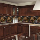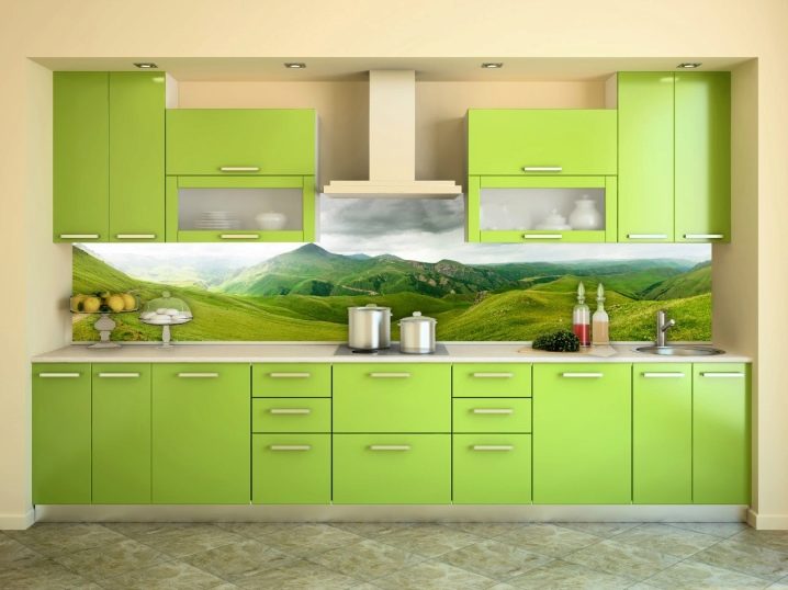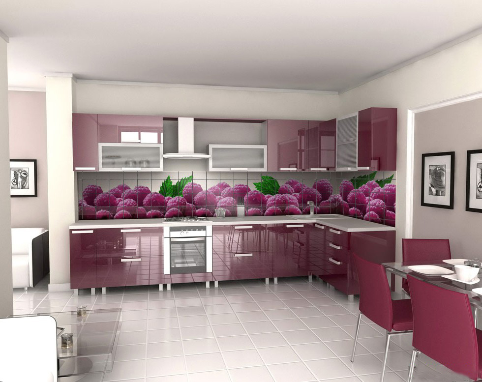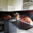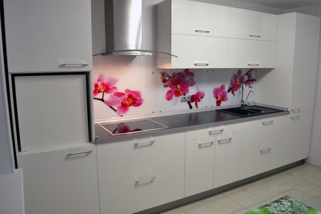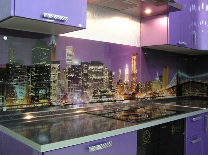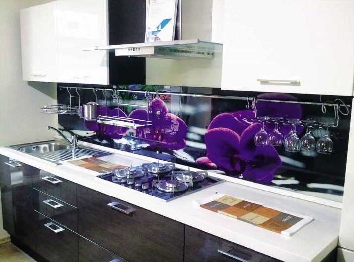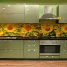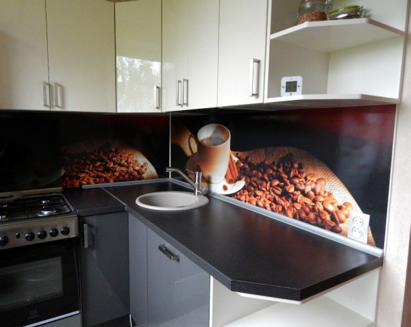 Panel mit zu hellen Fotodruck kann das Innere überladen.Diese Option ist nur geeignet, wenn der Rest der Küche in zurückhaltenden Farben gehalten ist. Auf einer zu dunklen Oberfläche werden sich Scheidungen und Beschädigungen deutlicher bemerkbar machen und eine leichte Schürze wird den Raum optisch erweitern.