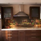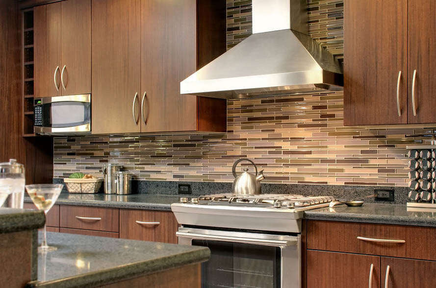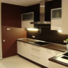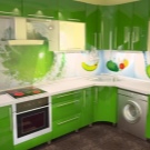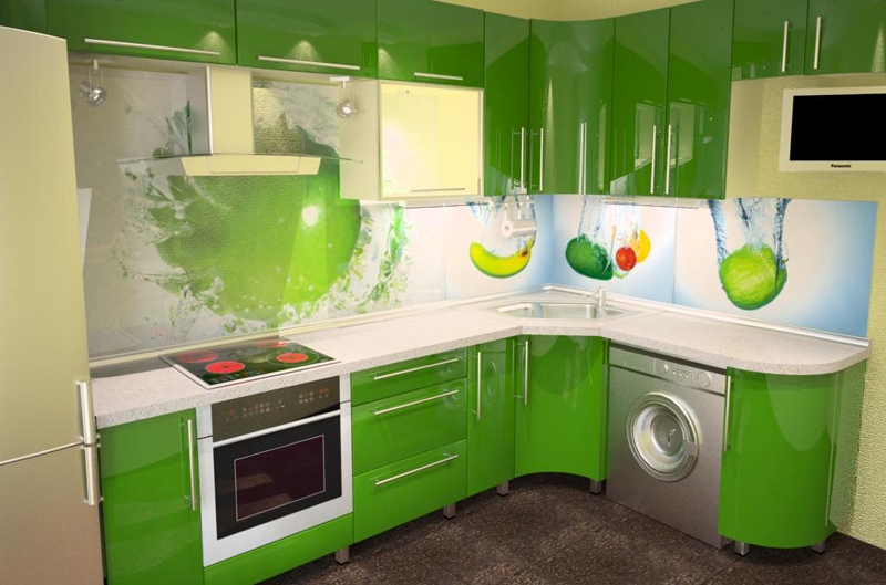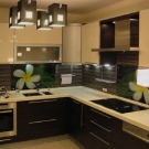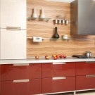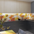 Die Farbe und das Design der Küchenschürze hängen von der Größe des Raumes und den Vorlieben des Besitzers ab. Sie sollten nicht für die Küche einer kleinen Größe zu dunkle Farben des Finish wählen, glänzende Oberflächen werden gut passen, sie haben reflektierende Eigenschaften, die den Raum optisch erweitert.