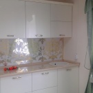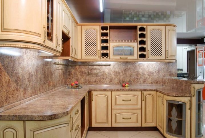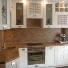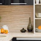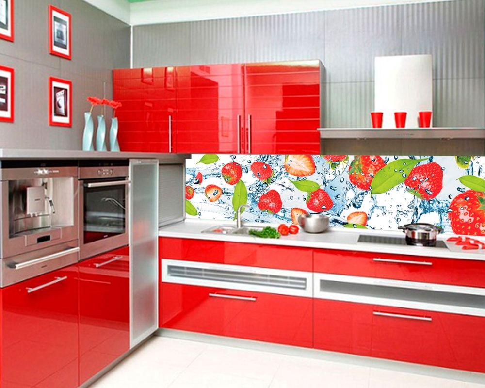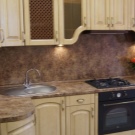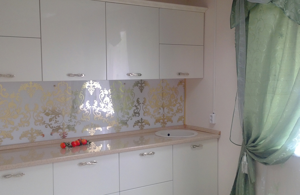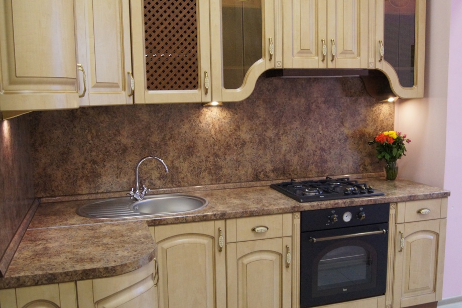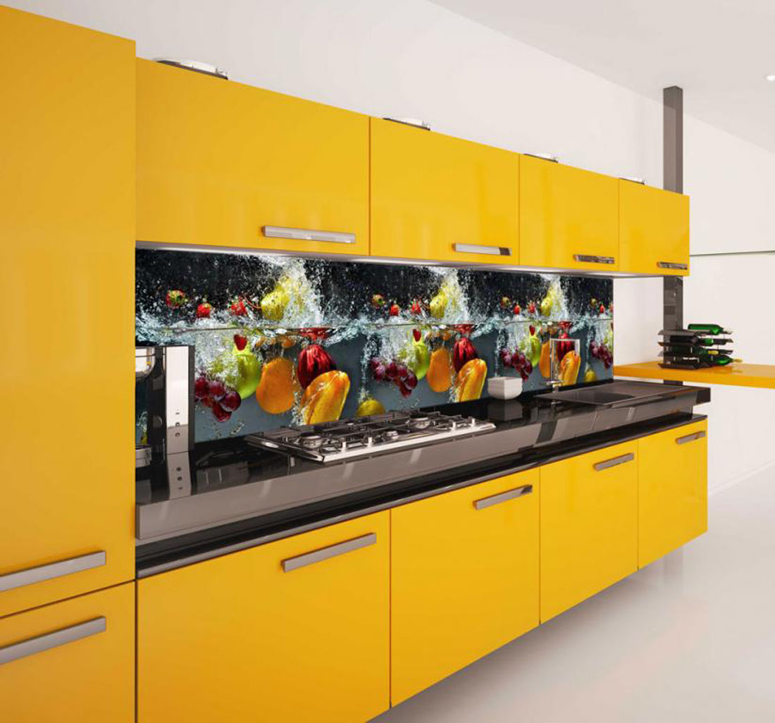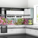 Hier ist die Fantasie grenzenlos, eine Küchenschürze kann mit einem riesigen Foto von Früchten oder einer angenehmen Landschaft geschmückt werden. Es wird eine gute Oberfläche mit Marmorimitat aussehen.