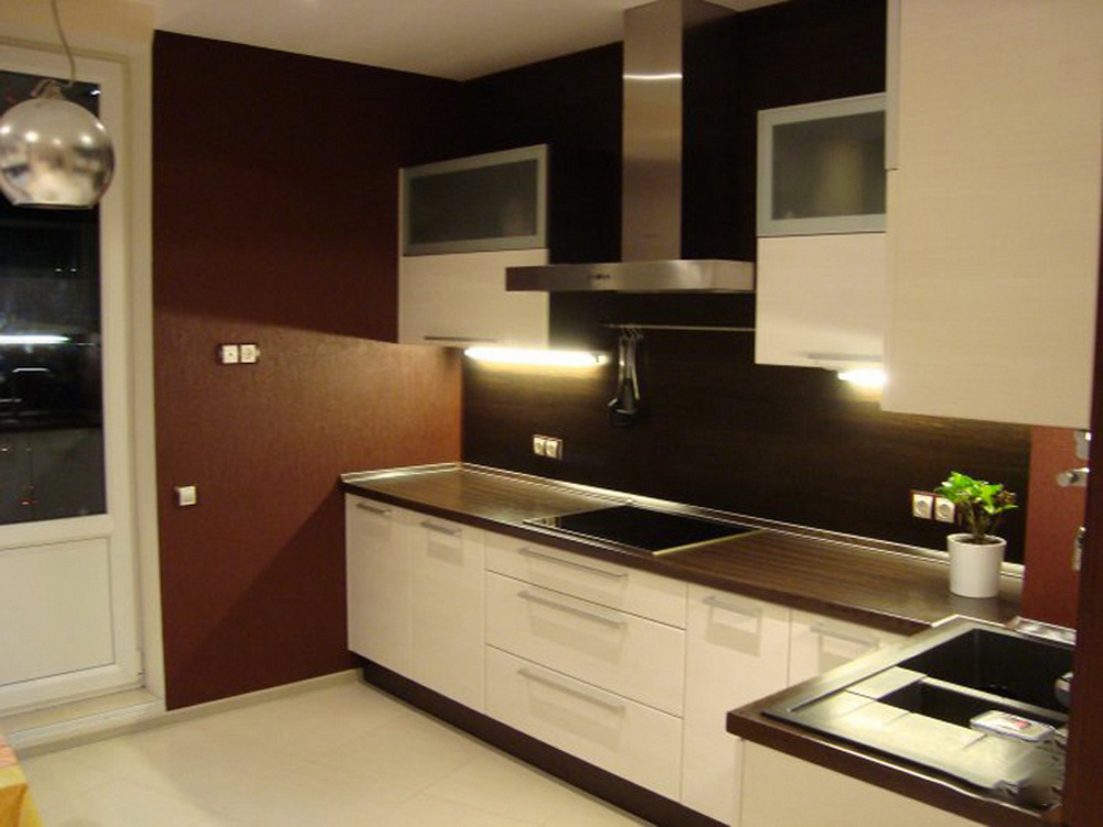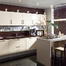 Diese Option wird in der Küche im Stil von "Loft" gut aussehen, ergänzt durch das Design von bemalten Holzkisten, einem großen Tisch aus Massivholz oder einem Bartresen mit Beleuchtung in Form von Hängelampen-Strahlern.