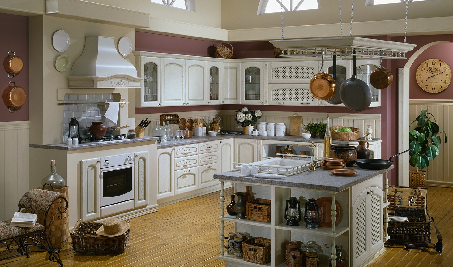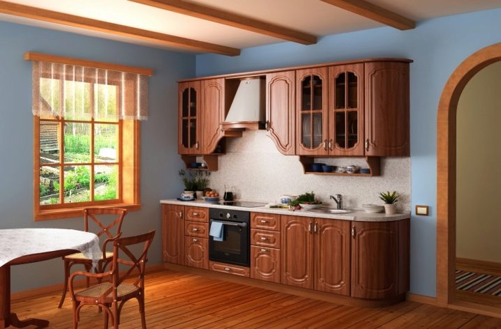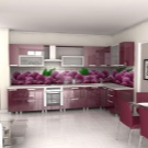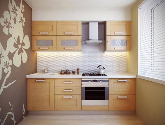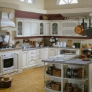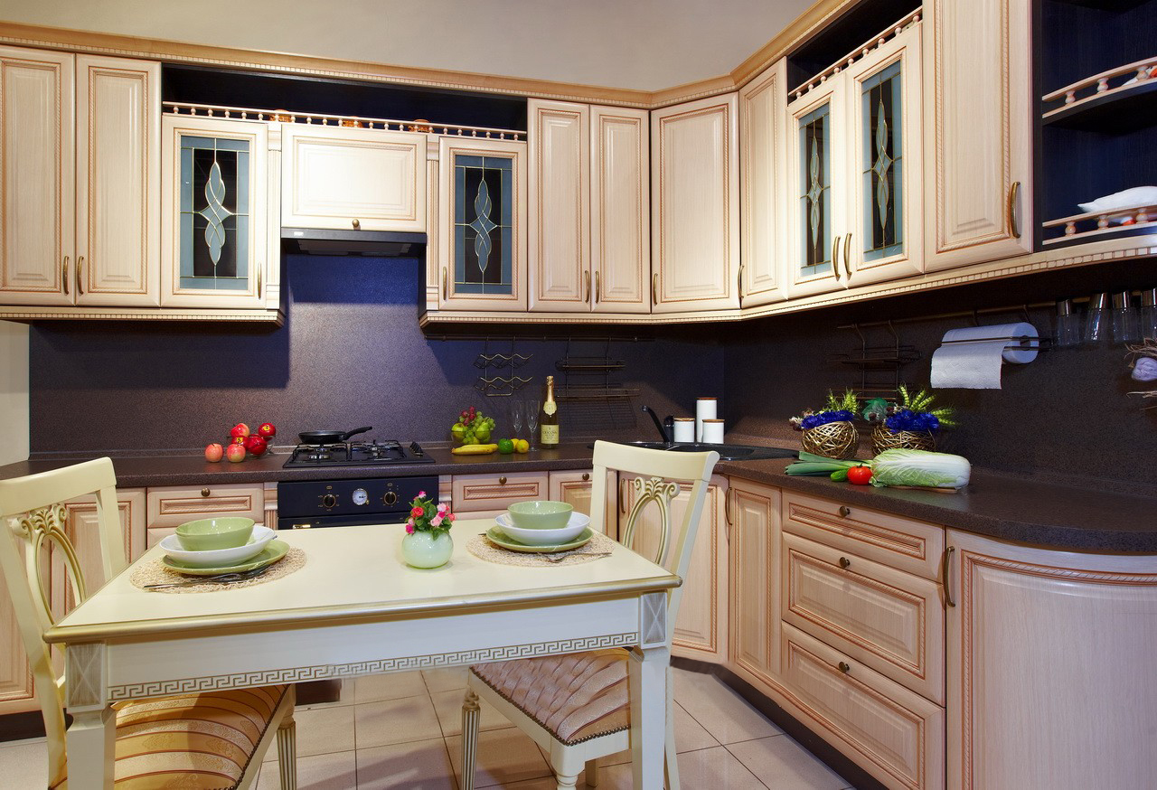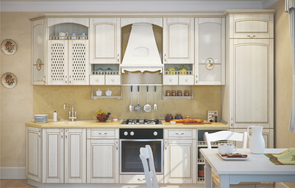 Kitchen Set kann in Pastellfarben bemalt werden: hell lila, hellblau, Pfirsich. Die kleine Liste mit pastoralen Landschaften oder Bildern von wilden Blumen wird gut aussehen. Solch ein Interieur wird eine warme und gemütliche Atmosphäre schaffen.