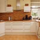 Die Schürze ist die Oberfläche der Küchenwand zwischen Herd und Wandschränken. Die Reinigung der Schürze ist ein großes Problem. Heiße Luft vom Ofen, Dampf, Sprühnebel - all dies wirkt sich auf die Oberfläche der Wände aus. Es ist sehr wichtig, ein feuchtigkeitsbeständiges und leicht zu reinigendes Material für die Küche zu wählen.