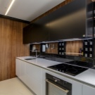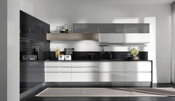 Die Küche im Stil von "High-Tech" schmückt die Schürze mit einem einfachen geometrischen Muster. Sie können eine monochrome Option auswählen oder farbige Streifen auf einem schwarzen Hintergrund platzieren. Solch ein heller Akzent sollte nur mit kleinen Details in Form von Kissen für Stühle oder Stoffservietten ergänzt werden. Der Rest des Innenraums ist besser in nüchternen Farben auszuführen.