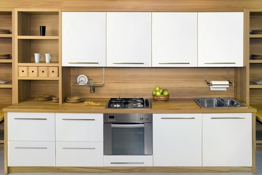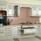 Funktionell helfen, den Platz der Vorfeldeinbauregale zu nutzen. Über der Arbeitsfläche in der Schürze können flache Regale für Gewürzdosen, Küchenmesser gestellt werden. Ein kleines Regal mit einer Querstange kann mit kleinen Flaschen Öl, Essig oder Wein dekoriert werden.