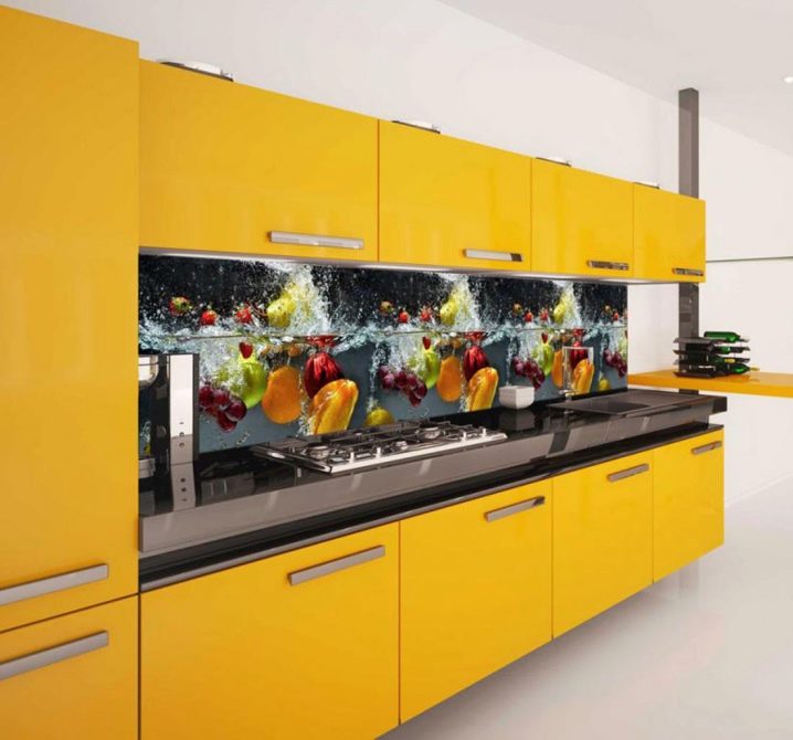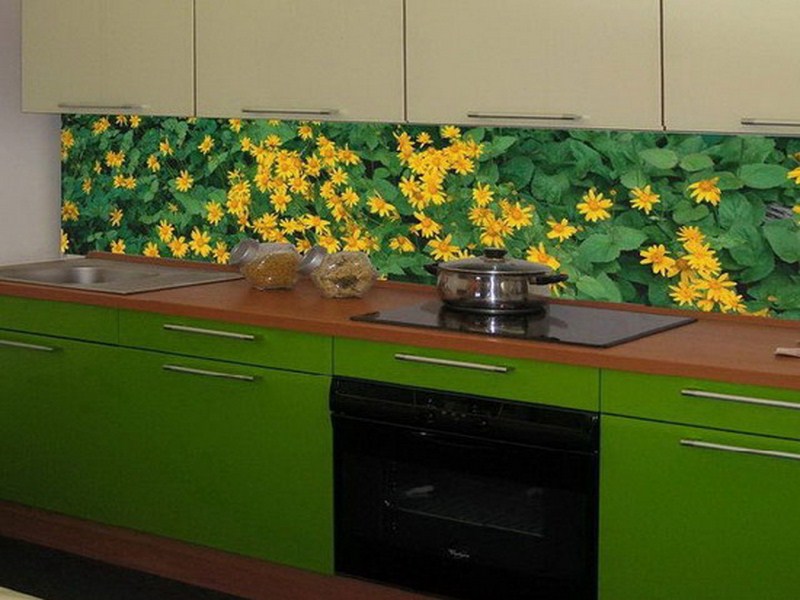Die Hauptdekoration der Küchenschürze kann ihre Beschaffenheit und Farbschema sein. Monolithische Oberfläche mit Nachahmung von Marmor oder teurem Holz ist in sich schön.Sie können eine exklusive Bestellung für den Fotodruck tätigen. Sehen Sie sich verschiedene Ornamente, große Blumen und Früchte an.