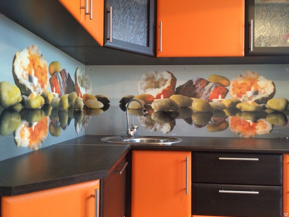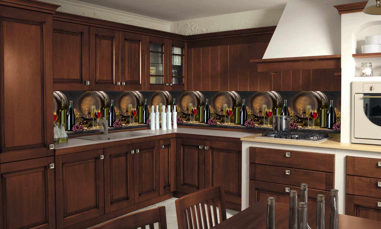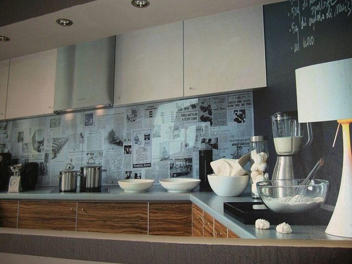 - Verschiedene Designlösungen. Panels mit Fotodruck schmücken den Kücheninnenraum. Sie können eine Holzoberfläche oder einen Stein imitieren.