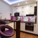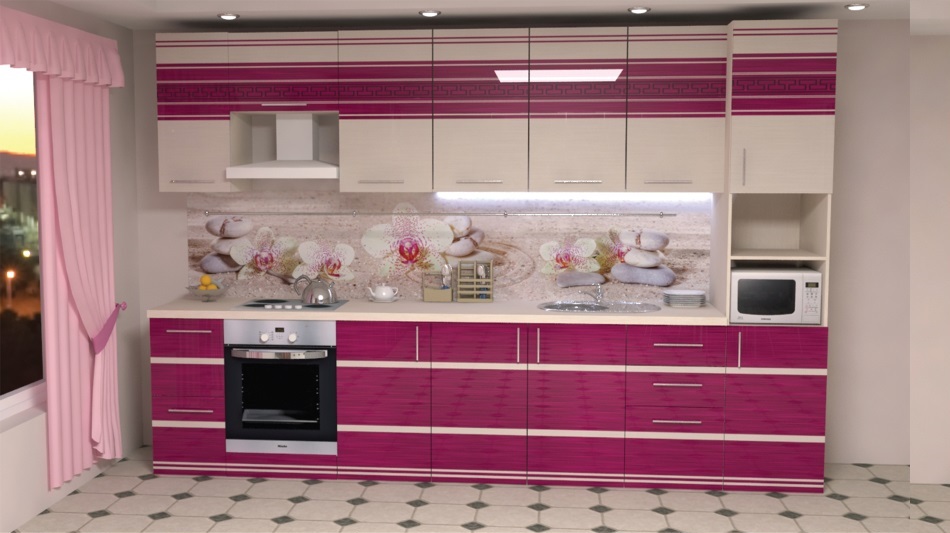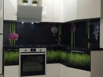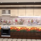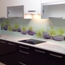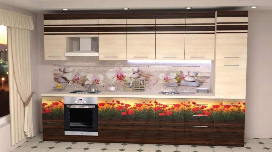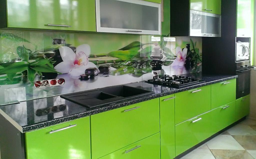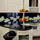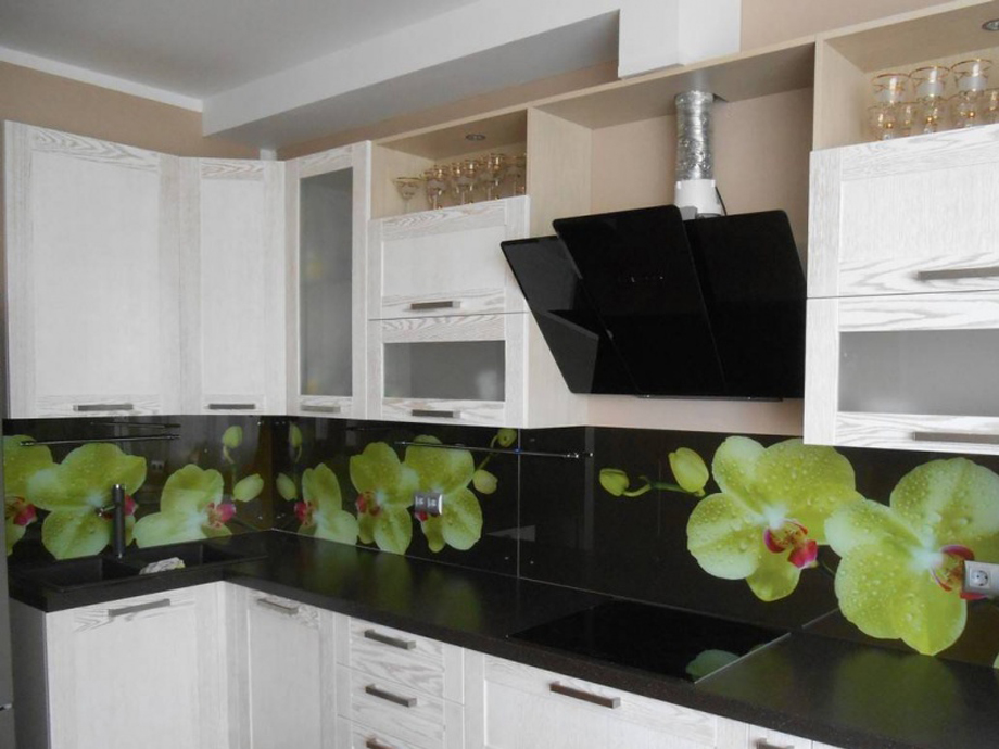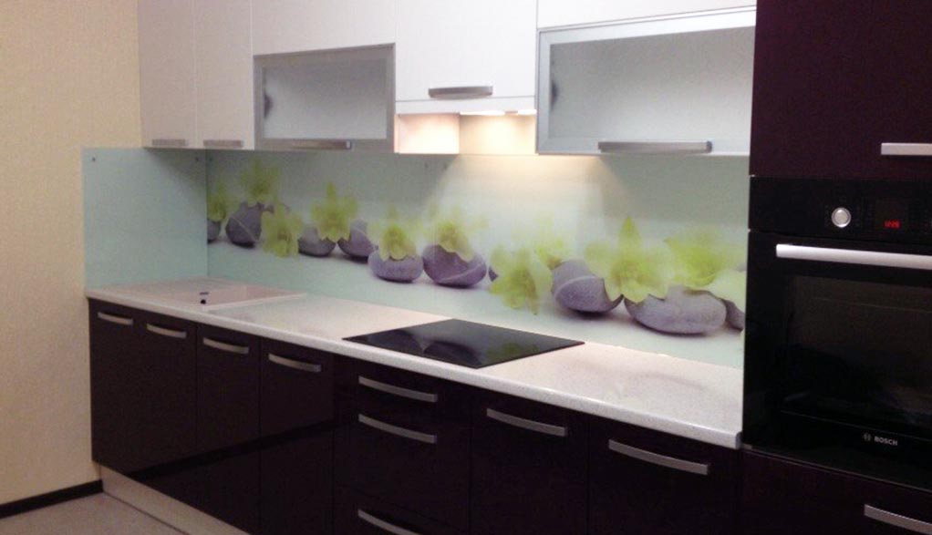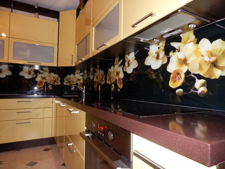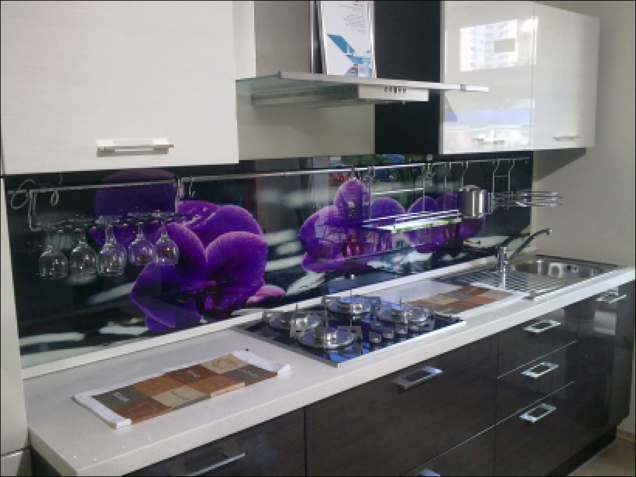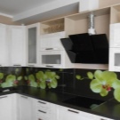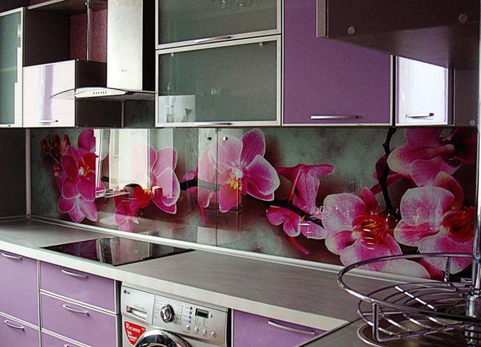 - Skinali Dies ist eine der Möglichkeiten von Glasplatten mit Fotodruck. Auch verwendet gehärtetes Glas, resistent gegen Schock, leicht von Fett und anderen Verunreinigungen zu reinigen. Solche Platten werden relativ schnell installiert, weil die Schürze normalerweise aus einer einzigen Platte besteht. Fotodruck mit Orchideen wird auf die andere Seite des Glases aufgetragen, die bündig mit der Wand abschließen wird.