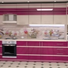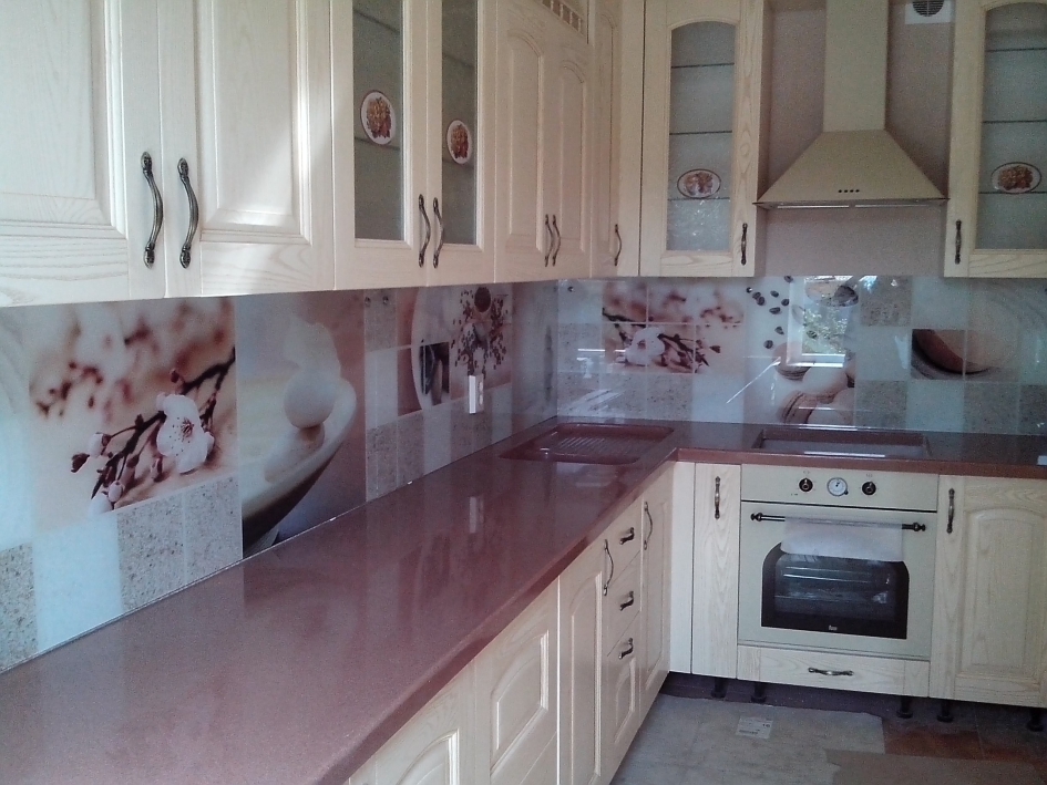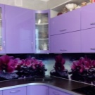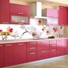 - Glas Bei der Herstellung von Schürzen für die Küche verwendete Orchid Hartglas. Dies ist ein ziemlich haltbares Material mit einer hohen Transparenz. Die Glasscheibe ist mit einer an der Wand vorgetapeten Tapete abgedeckt. Diese Schürze hat ein attraktives Aussehen und ausgezeichnete Leistungseigenschaften.